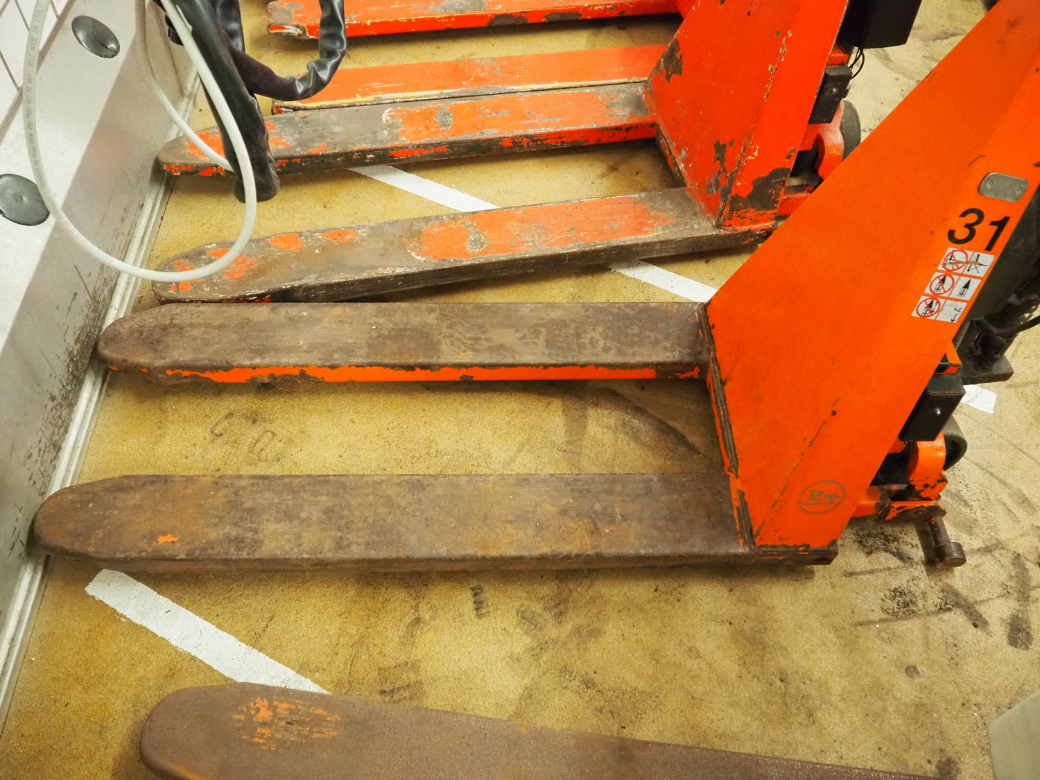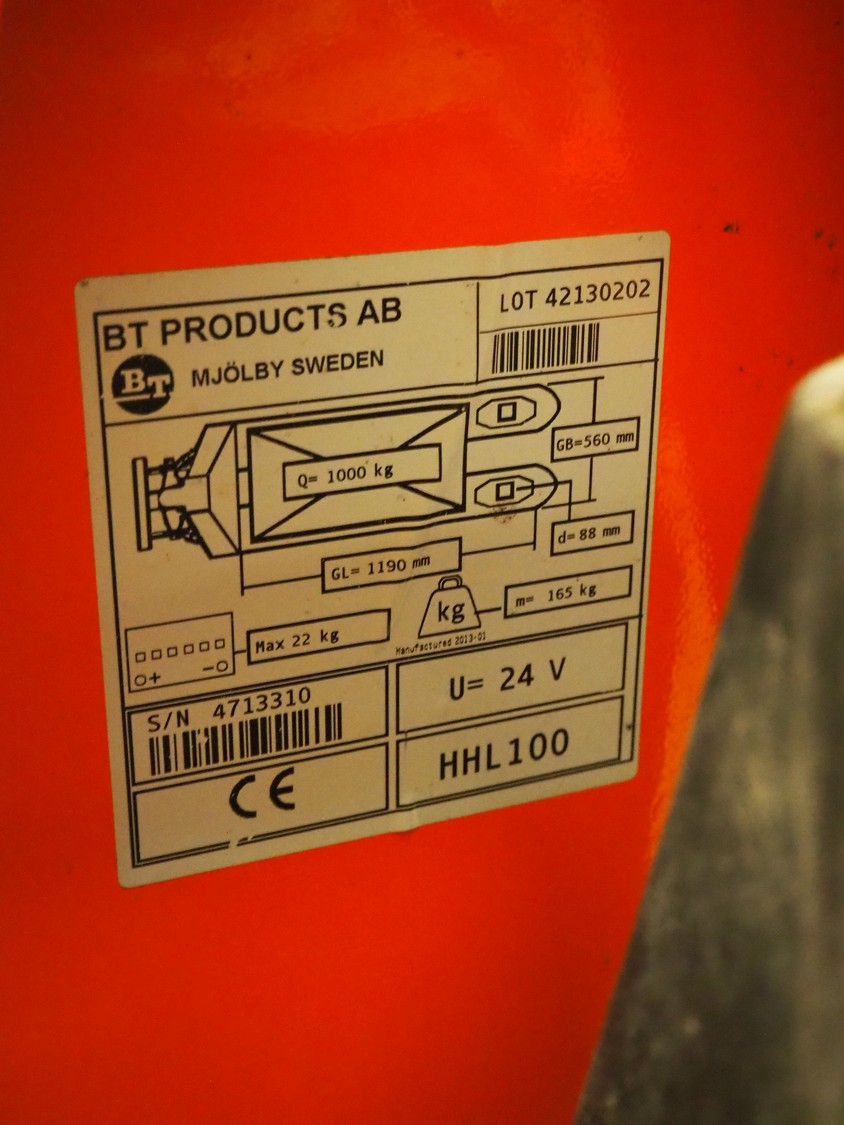 BT Products AB electric pallet lifter, model: HHL100, serial number: 4713310, year of construction: 01-2013, capacity: 1000 kg, steel forks, fork length: 1180 mm, total dimensions: 1800 mm x 750 mm x 1850 mm.