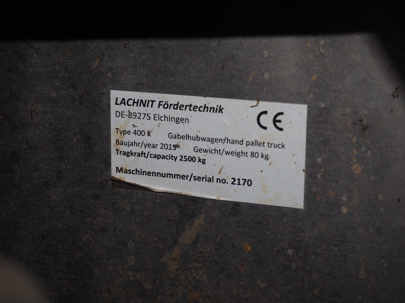 Lachnit Fördertechnik pallet lifter, type: 400 K, serial number: 2170, year of construction: 2015, machine weight: 80 kg, capacity: 2500 kg, fork length: 1150 mm, fork width: 520 mm, distance between forks: 205 mm, total dimensions: 1550 mm x 530 mm x 1230 mm.