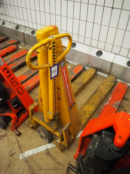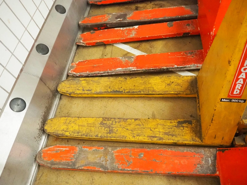 Vestergaard steel pallet lifter, type: HPV800, model: 116-049, serial number: 2225, year of construction: 1984, capacity: 800 kg, weight: 129 kg, fork length: 1120 mm, total dimensions: 1550 mm x 520 mm x 1150 mm.