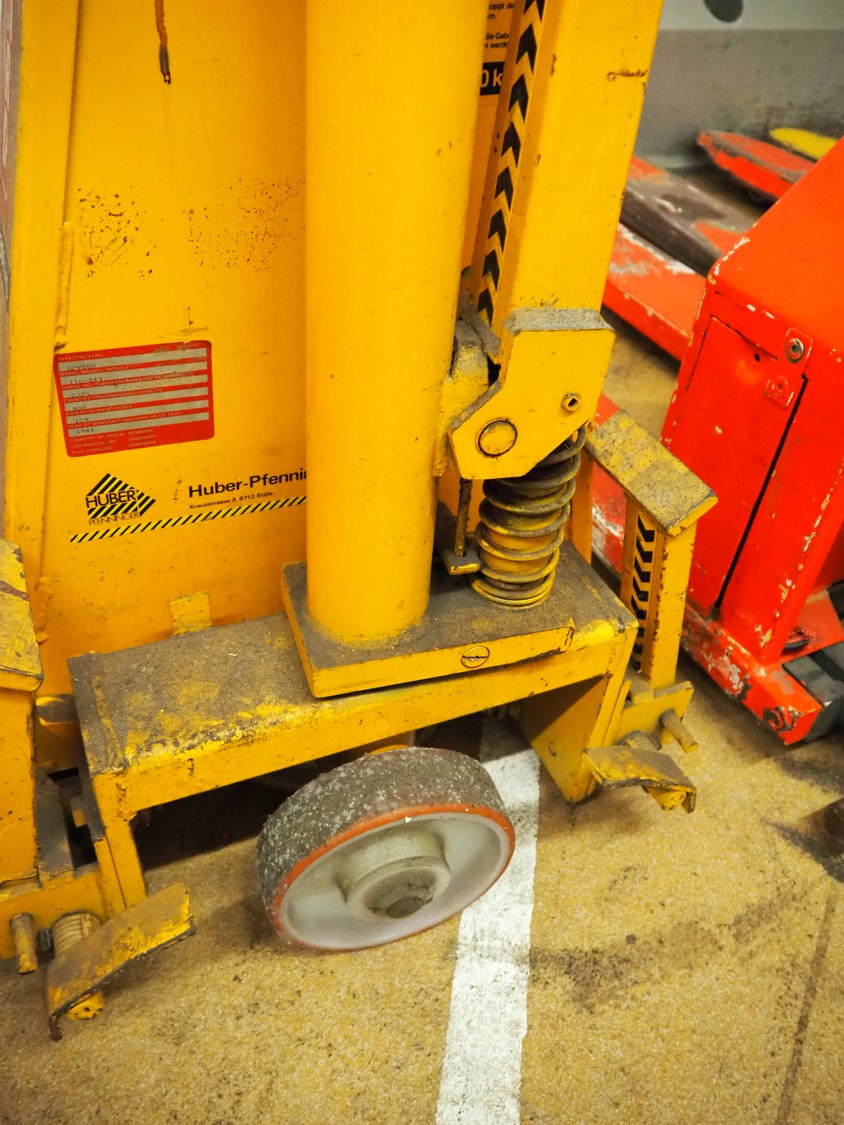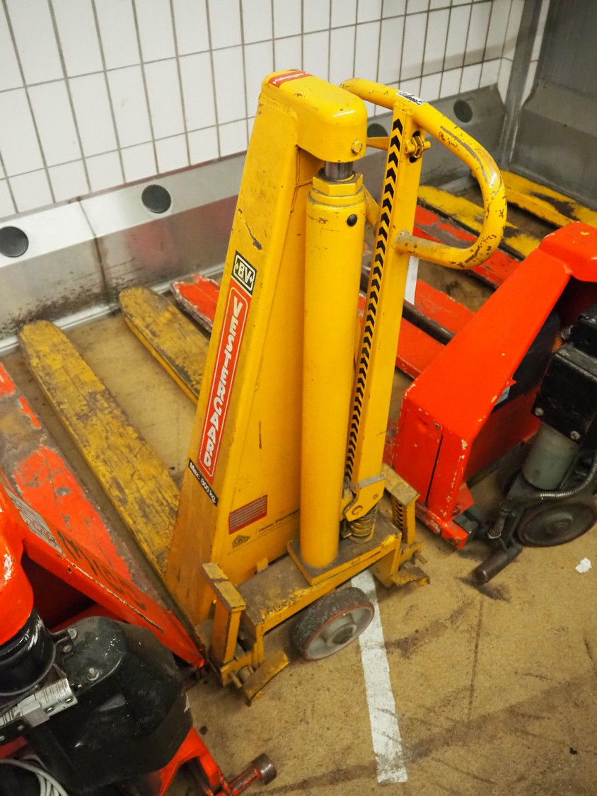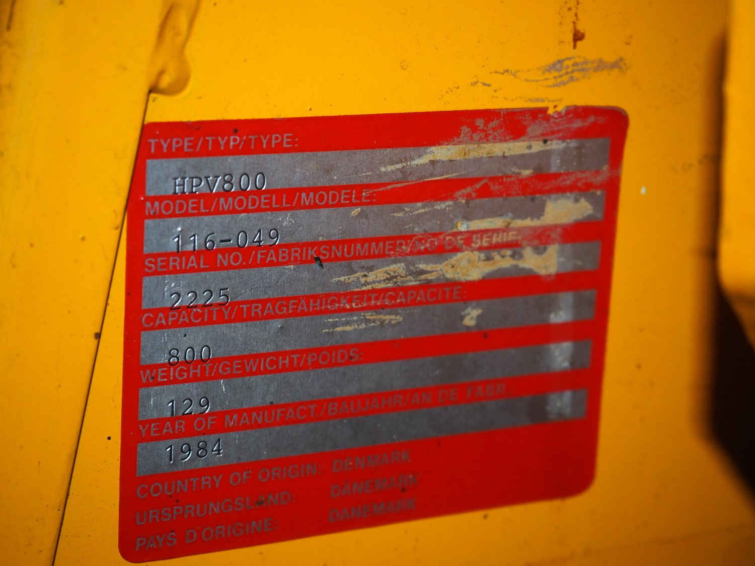 Vestergaard steel pallet lifter, type: HPV800, model: 116-049, serial number: 2225, year of construction: 1984, capacity: 800 kg, weight: 129 kg, fork length: 1120 mm, total dimensions: 1550 mm x 520 mm x 1150 mm.