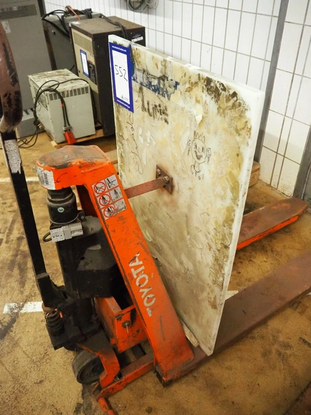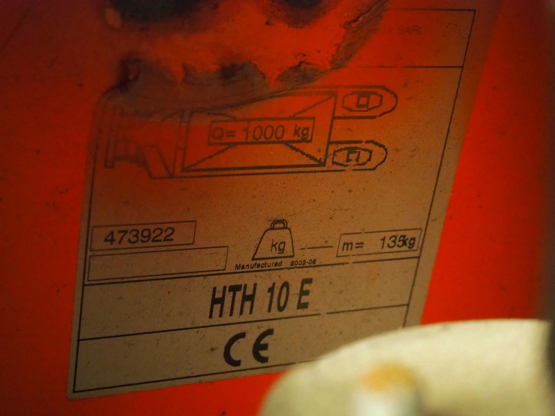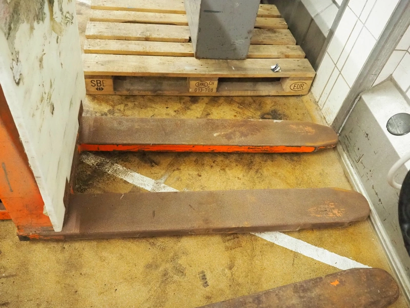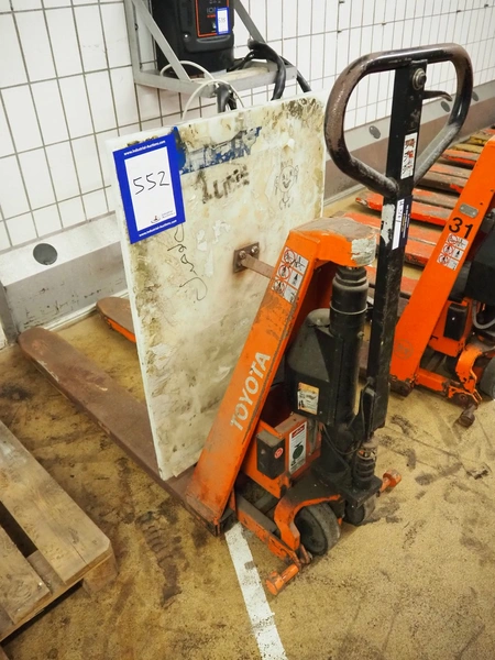 Toyota steel pallet lifter, model: HTH 10 E, capacity: 1000 kg, fork length: 1200 mm, total dimensions: 1600 mm x 600 mm x 1300 mm. Incomplete, missing battery.