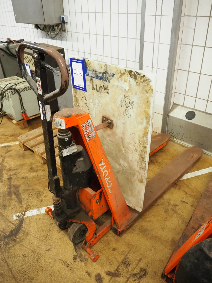 Toyota steel pallet lifter, model: HTH 10 E, capacity: 1000 kg, fork length: 1200 mm, total dimensions: 1600 mm x 600 mm x 1300 mm. Incomplete, missing battery.
