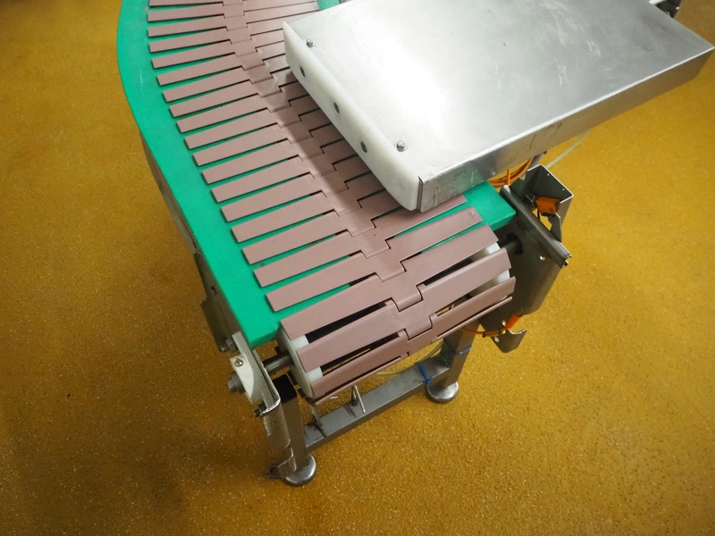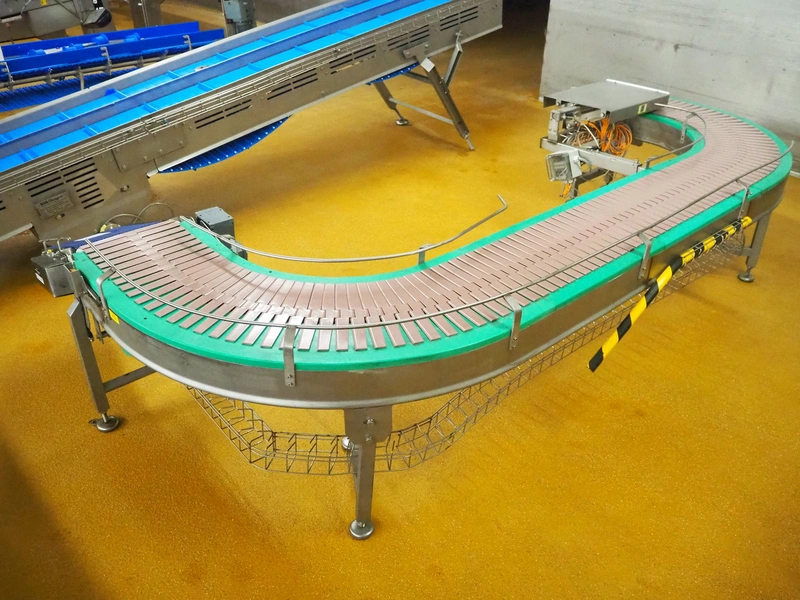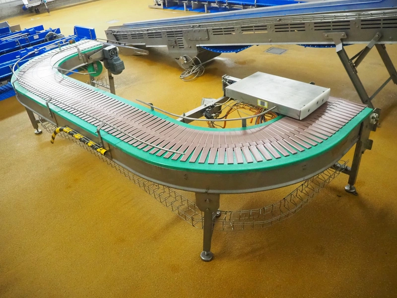 180° curved conveyor, s/s frame, plastic belt, belt width: 300 mm, total dimensions: 3300 mm x 1800 mm x 730 mm.