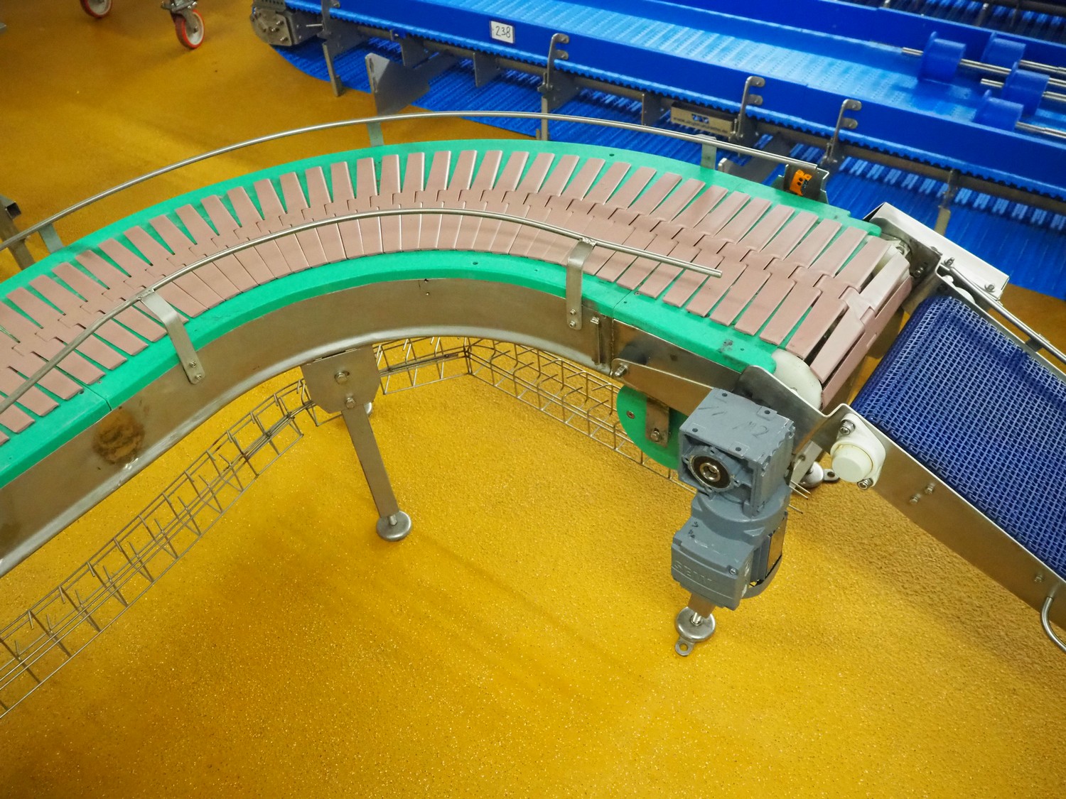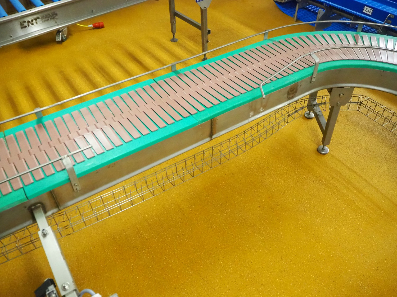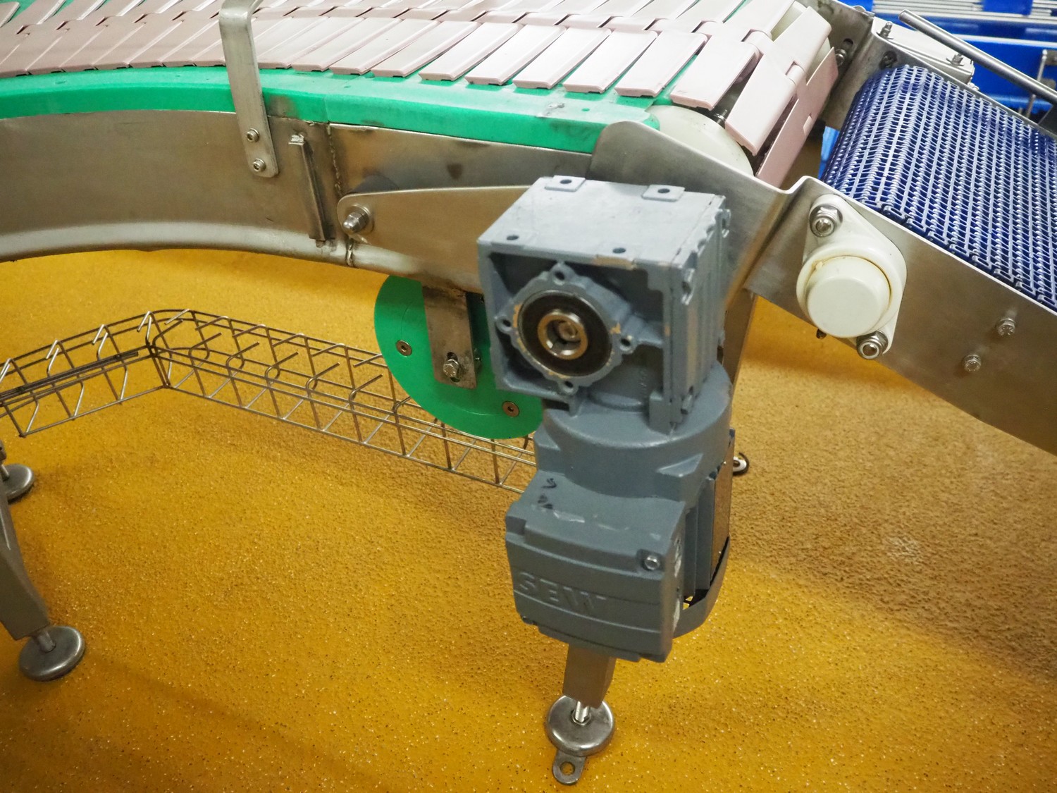 180° curved conveyor, s/s frame, plastic belt, belt width: 300 mm, total dimensions: 3300 mm x 1800 mm x 730 mm.