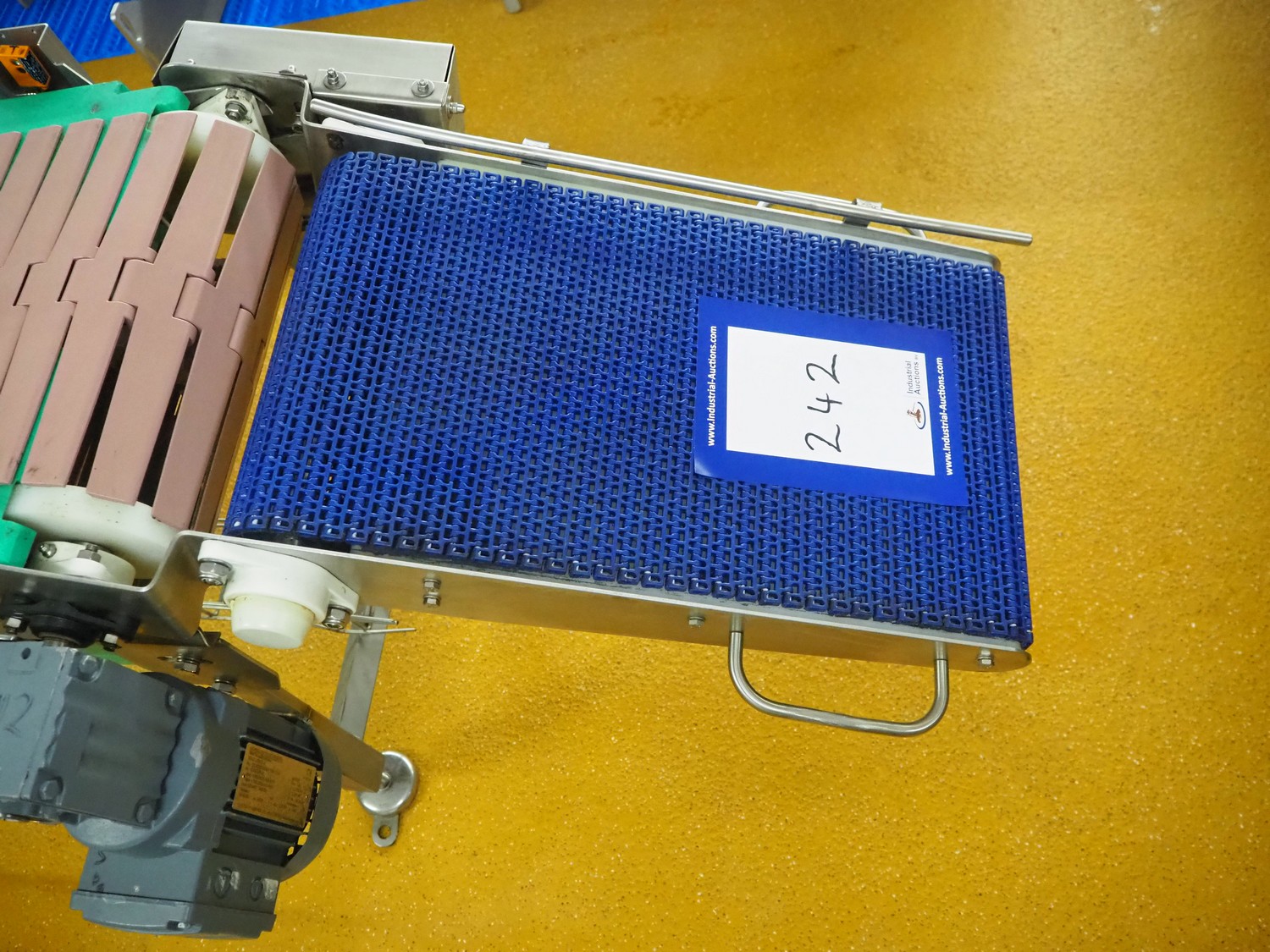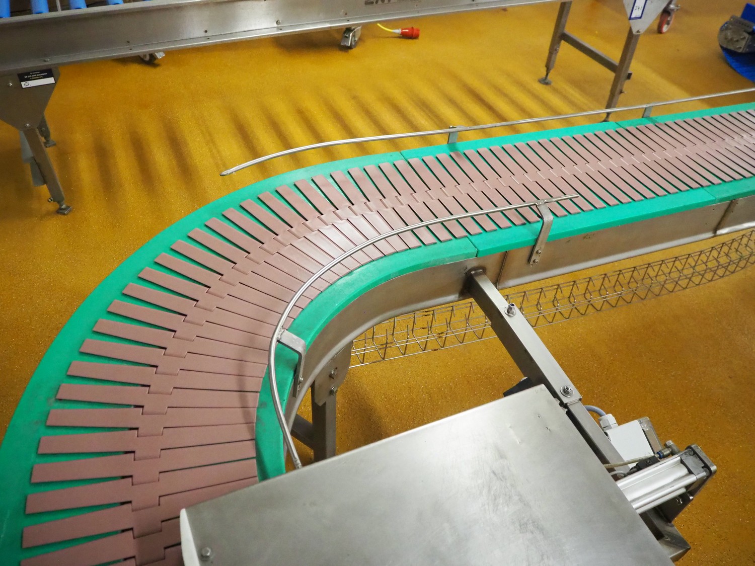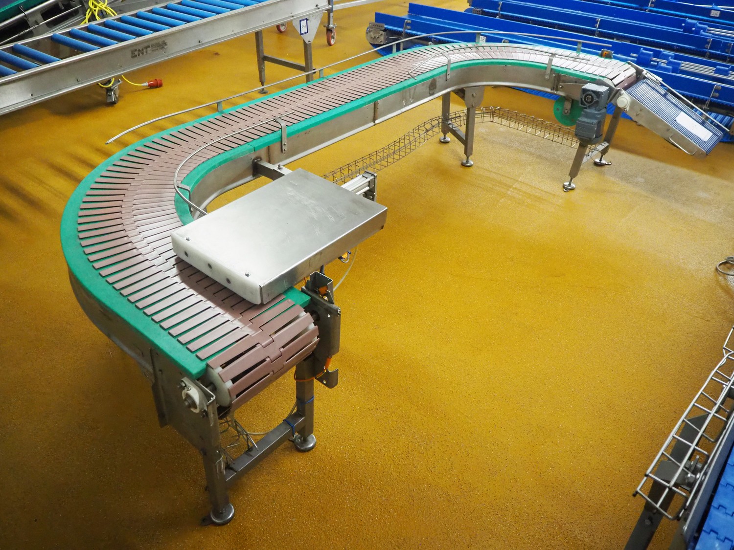 180° curved conveyor, s/s frame, plastic belt, belt width: 300 mm, total dimensions: 3300 mm x 1800 mm x 730 mm.