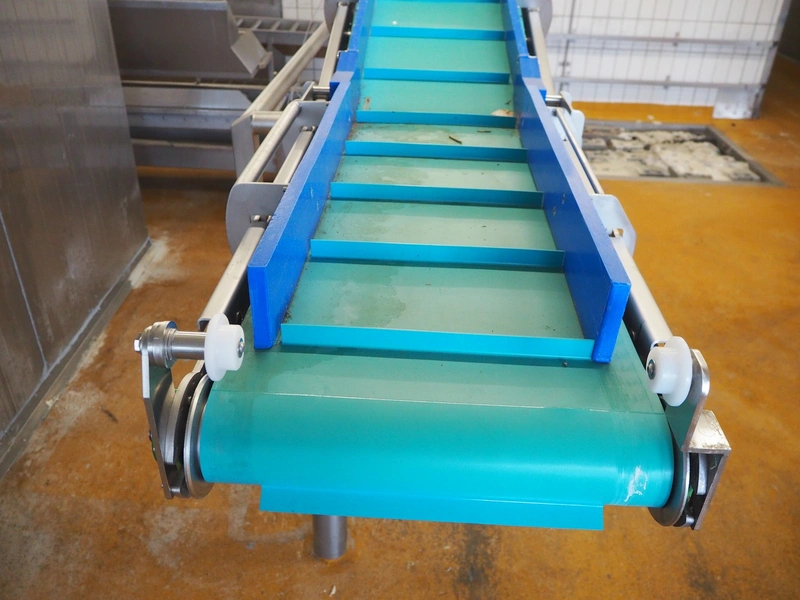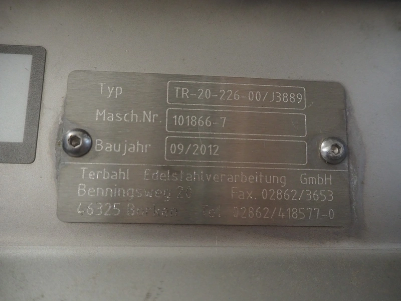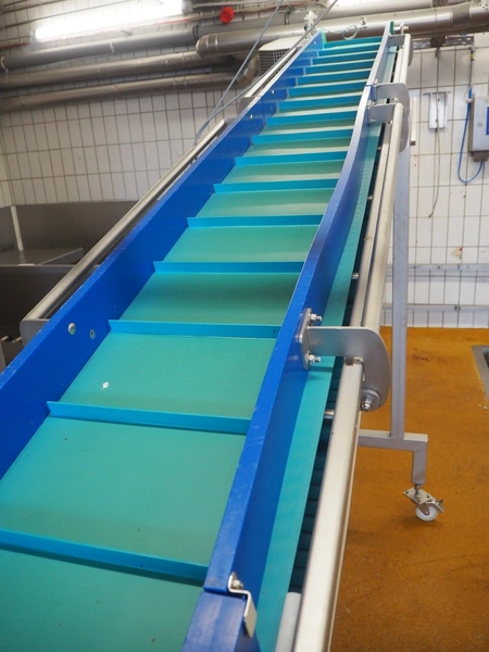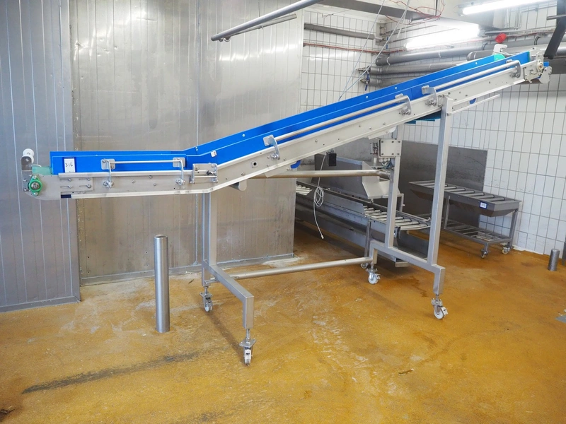 Terbahl mobile elevating belt, type: TR-20-226-00/J3889, machine number: 101866-7, year of construction: 09/2012, s/s frame, plastic belt with dividers, belt width: 450 mm, distance between dividers: 200 mm, divider height: 25 mm, elevating height: 2200 mm, total dimensions: 4500 mm x 1000 mm x 2400 mm.