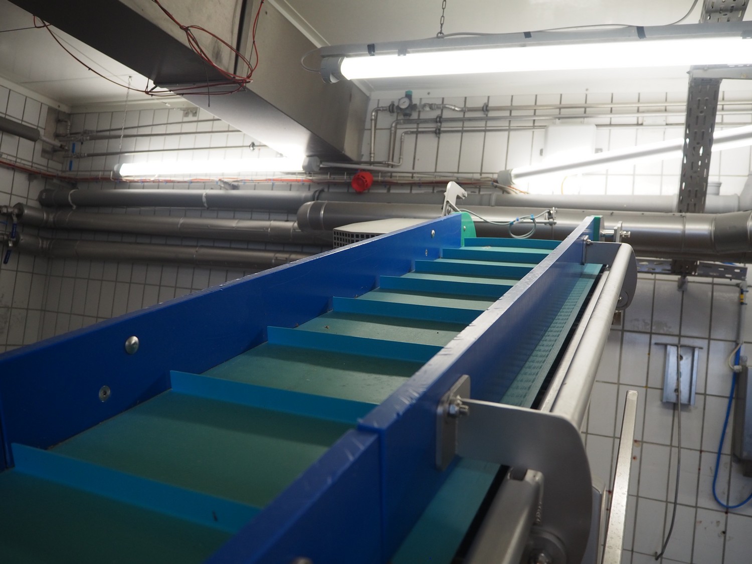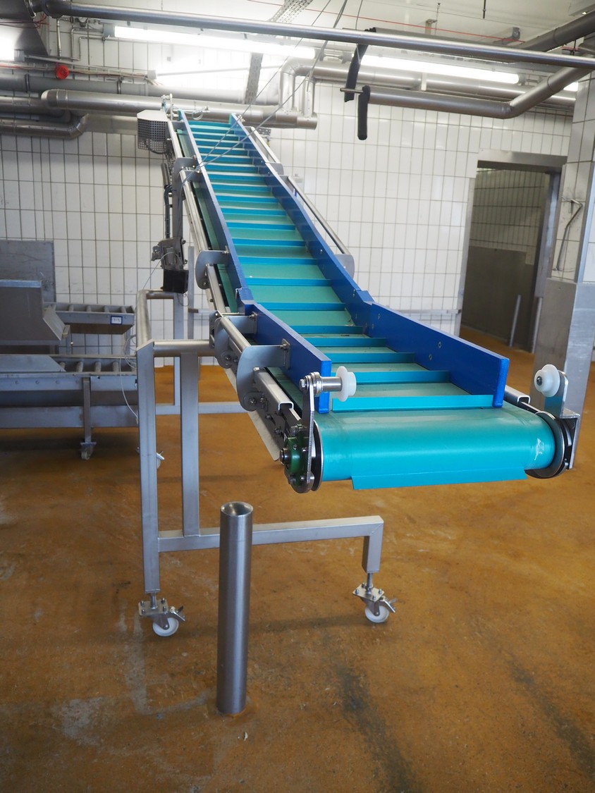 Terbahl mobile elevating belt, type: TR-20-226-00/J3889, machine number: 101866-7, year of construction: 09/2012, s/s frame, plastic belt with dividers, belt width: 450 mm, distance between dividers: 200 mm, divider height: 25 mm, elevating height: 2200 mm, total dimensions: 4500 mm x 1000 mm x 2400 mm.