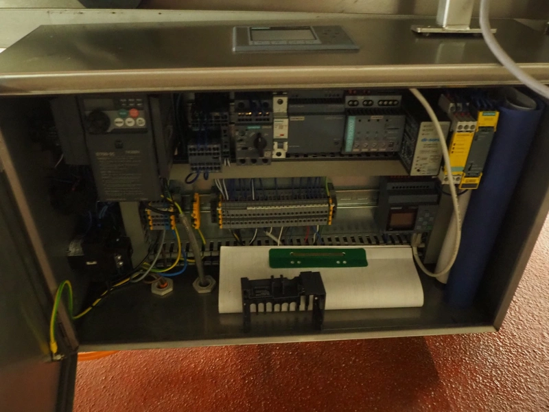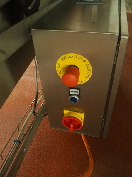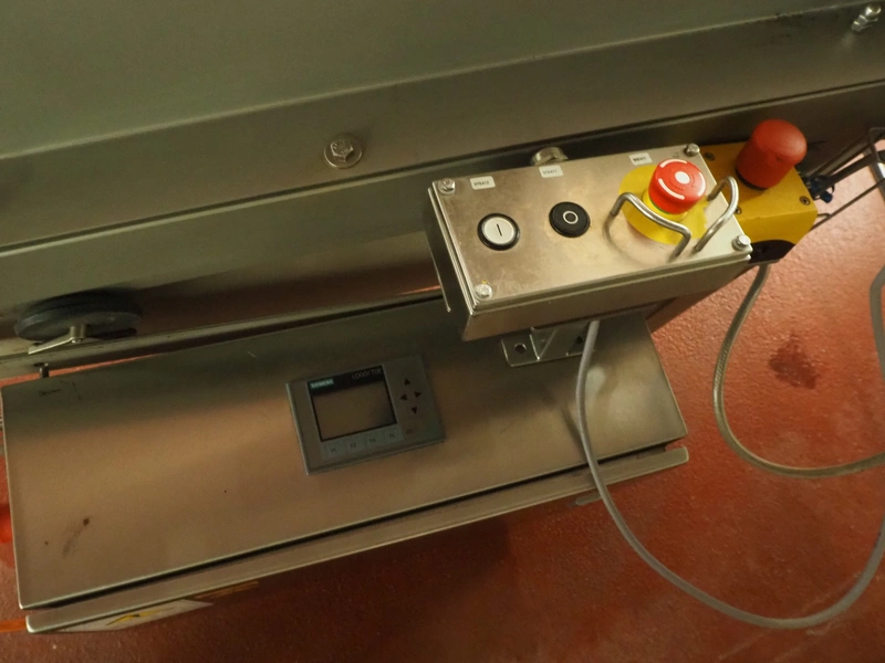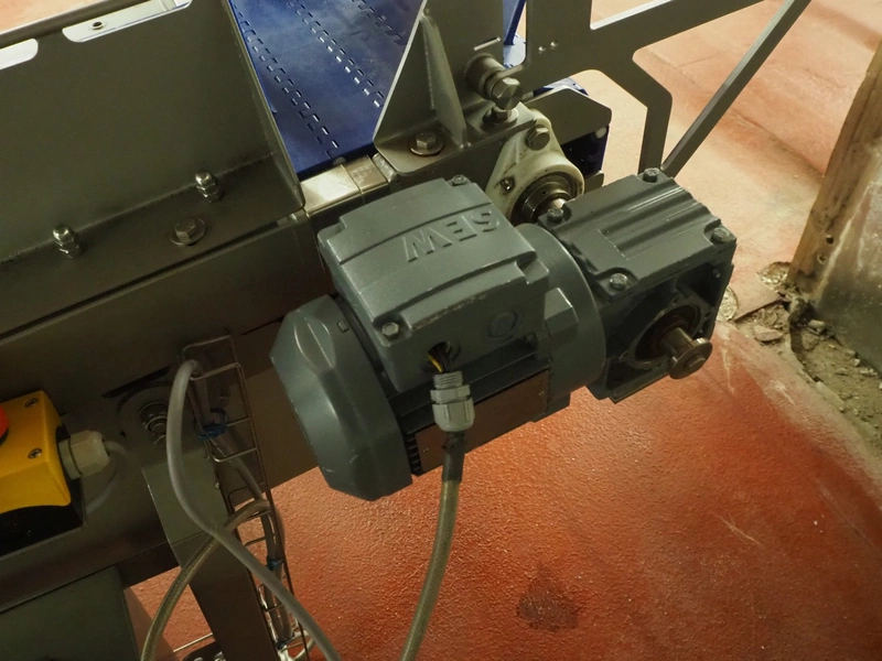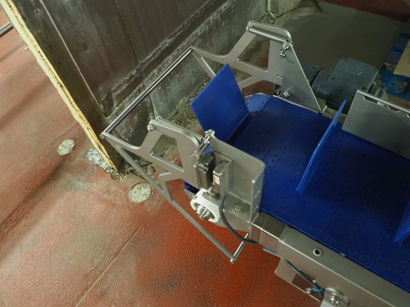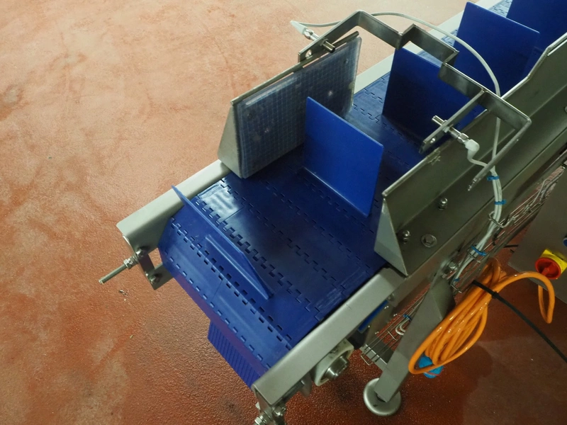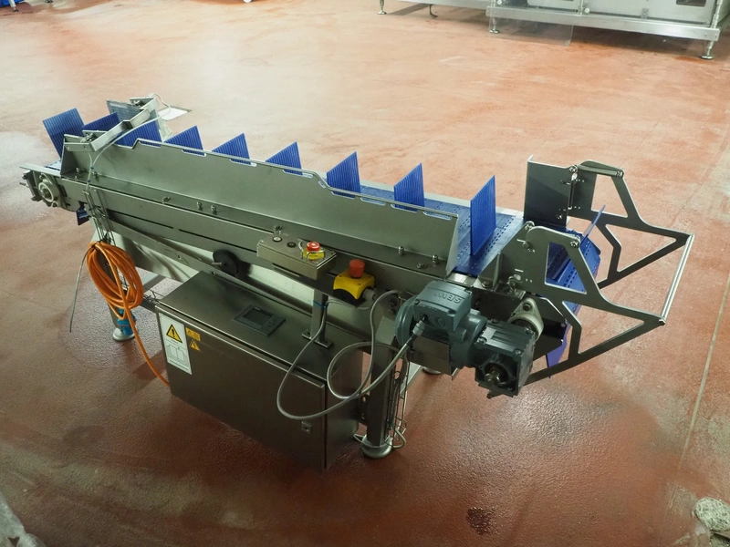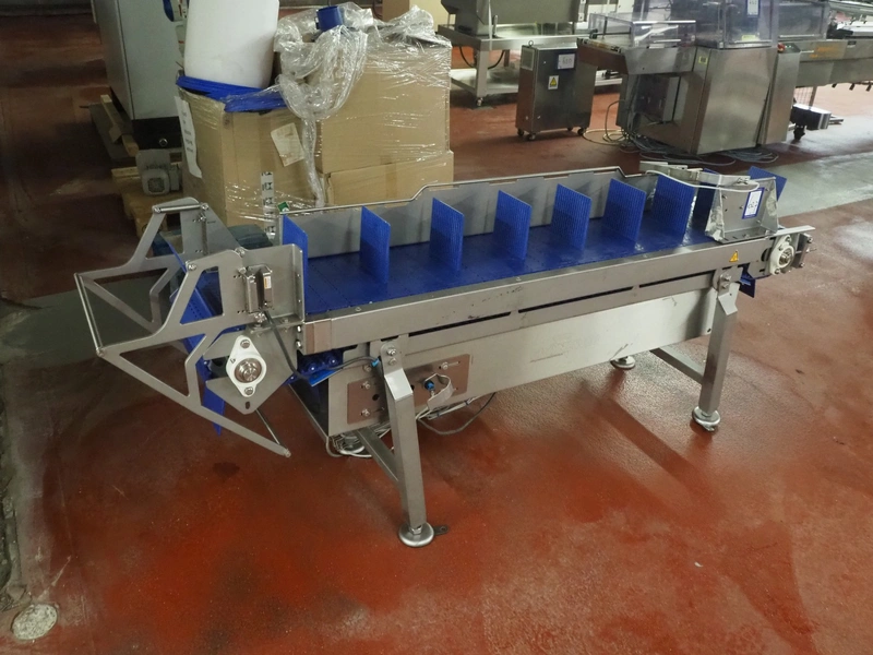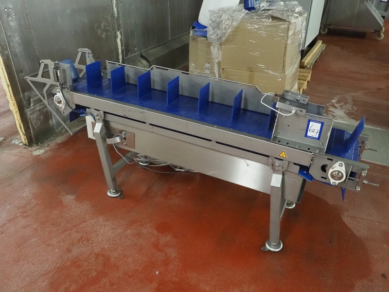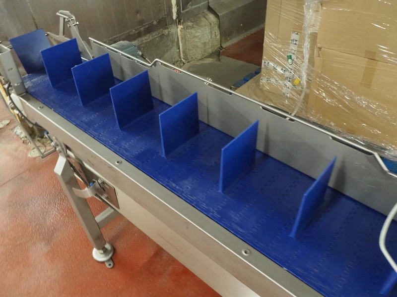 Transport belt, plastic belt with dividers, belt width: 300 mm, dividers height: 150 mm, distance between dividers: 200 mm, total dimensions: 2300 mm x 600 mm x 930 mm.