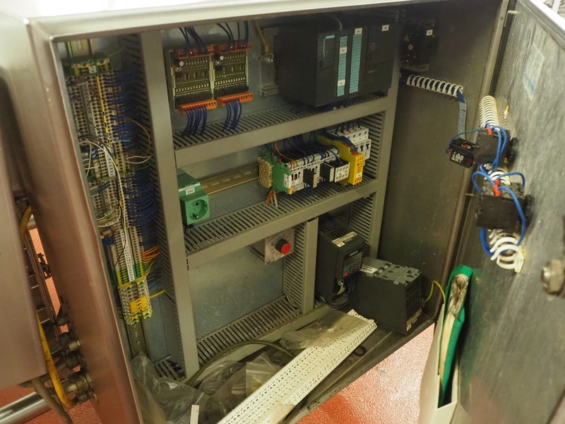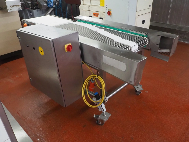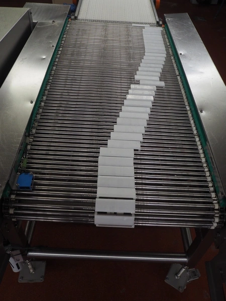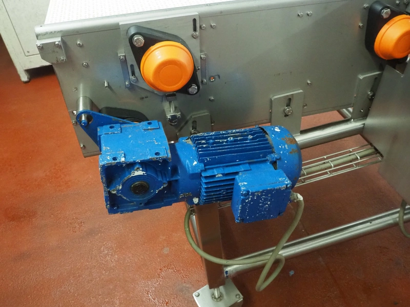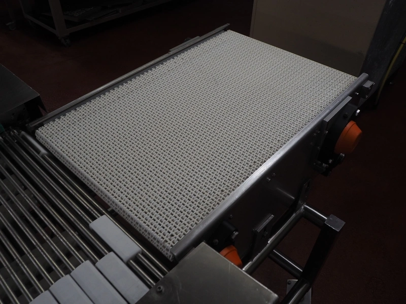 Schmidt Transpo mobile transport belt, number: 5639, year of construction: 2003-10, plastic mesh belt, belt width: 500 mm, s/s belt with plastic plates, plastic plates width: 110 mm, total dimensions: 2440 mm x 1250 mm x 1150 mm.