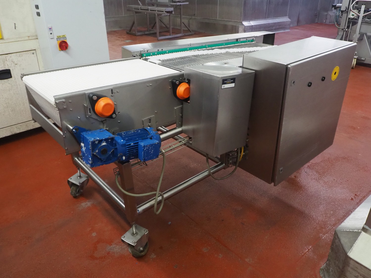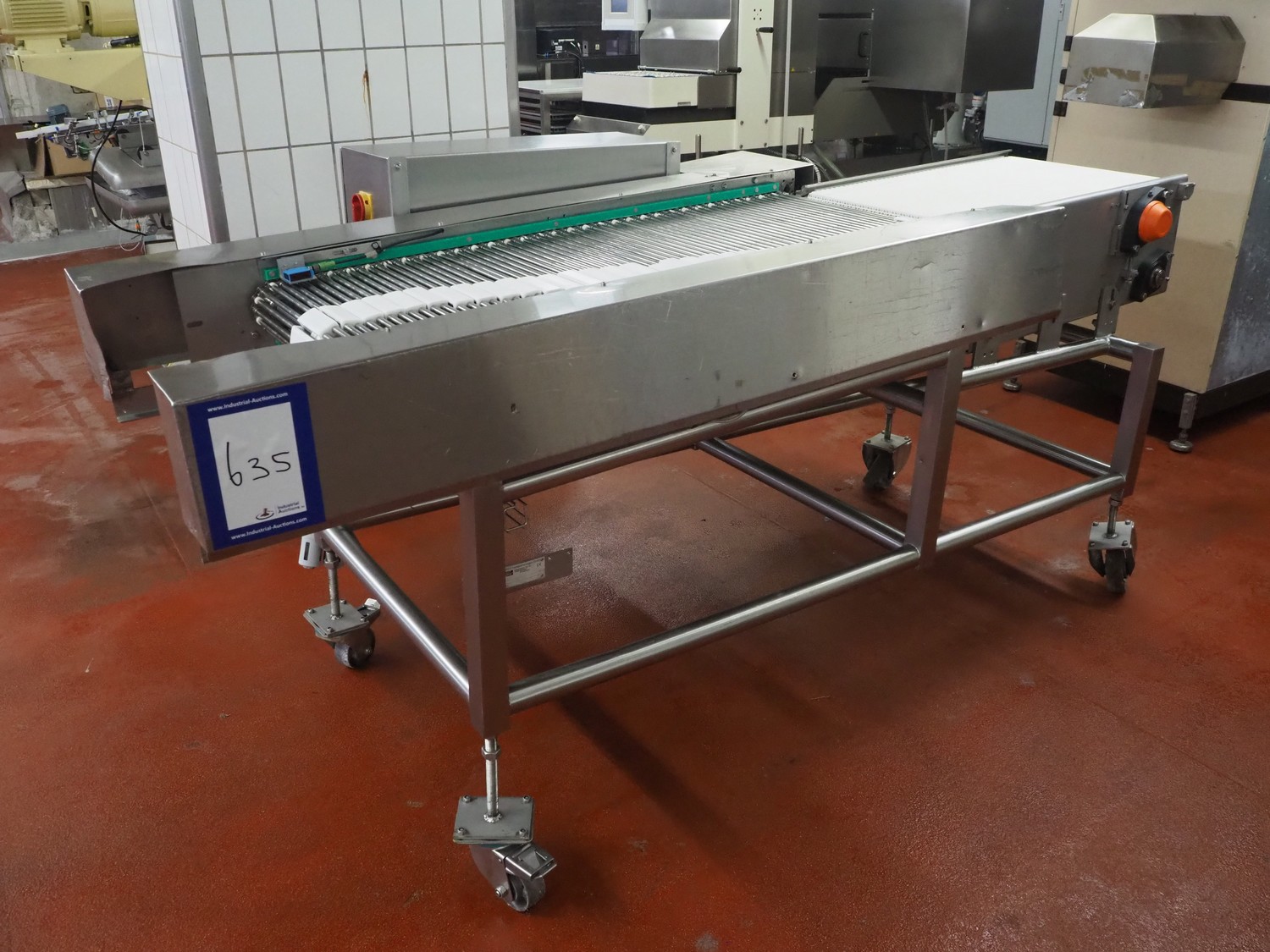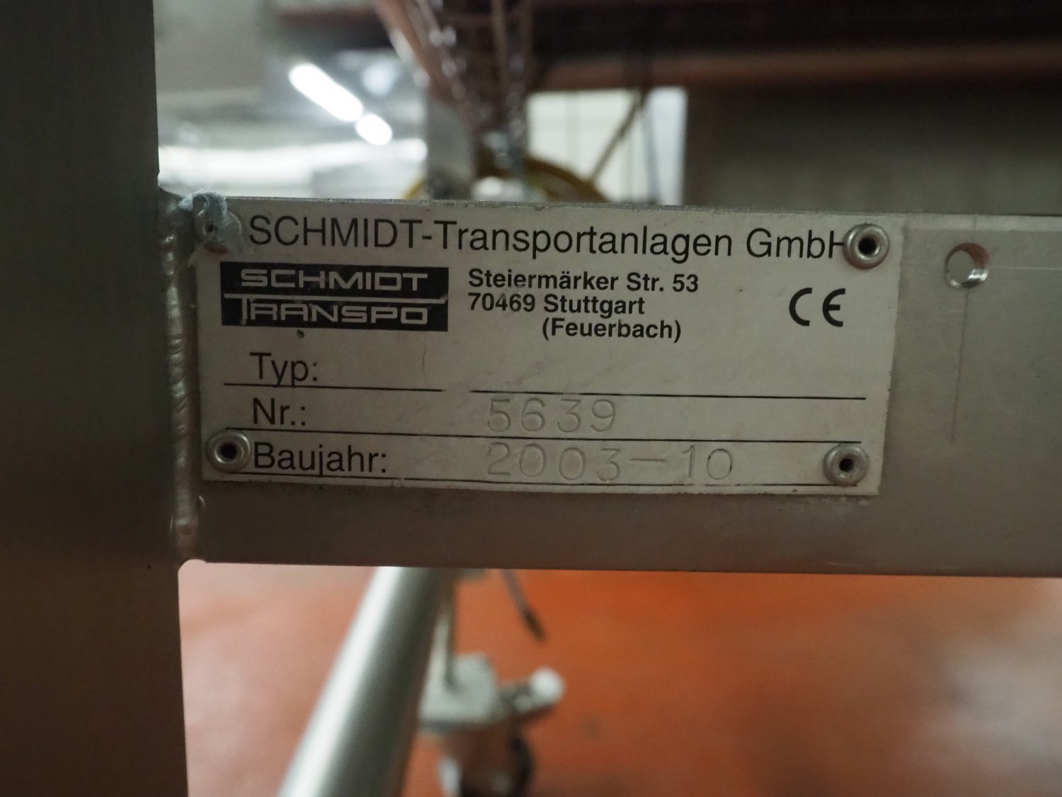 Schmidt Transpo mobile transport belt, number: 5639, year of construction: 2003-10, plastic mesh belt, belt width: 500 mm, s/s belt with plastic plates, plastic plates width: 110 mm, total dimensions: 2440 mm x 1250 mm x 1150 mm.