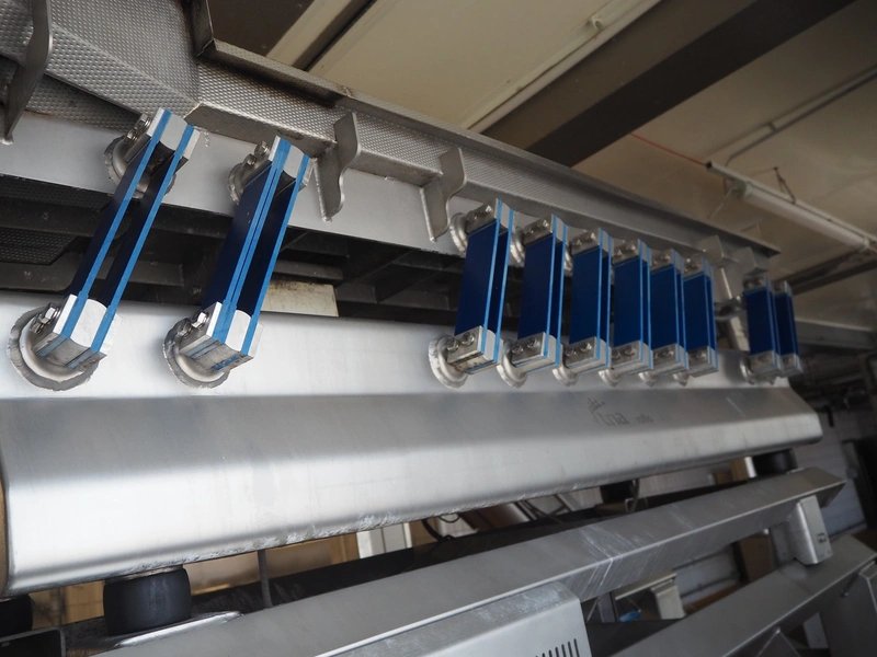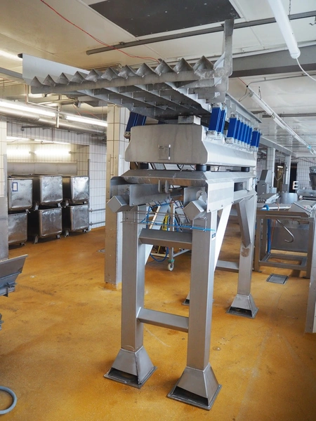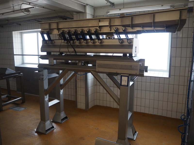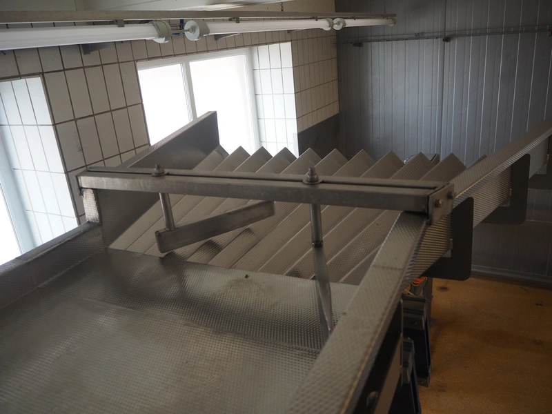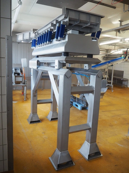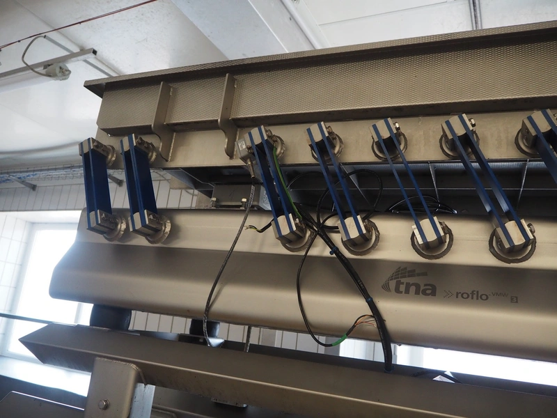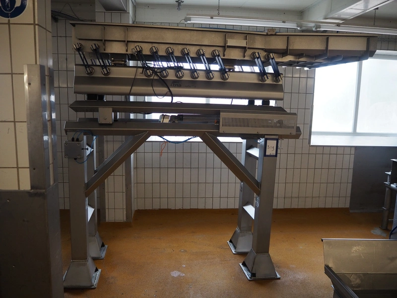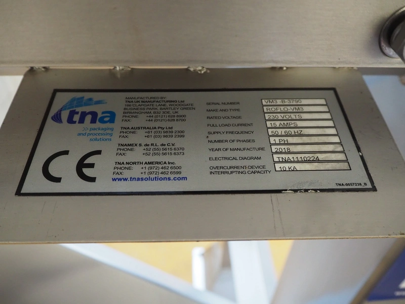 TNA vibrating gutter, type: Roflo-VM3, serial number: VM3-B-3790, year of construction: 2018, 230 V, 1 Ph, 50/60 Hz, 15 A, s/s gutter, gutter width: 600 mm, total dimensions: 3200 mm x 1400 mm x 2600 mm.