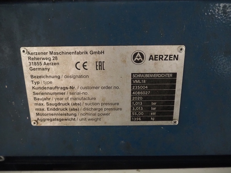 Aerzener Maschinenfabrik GmbH screw air compressor, type: VML18, serial number: 4086027, year of construction: 2020, suction pressure: 1.013 bar, discharge pressure: 3.013, nominal power: 55.00 kW, machine weight: 1396 kg, dimensions: 1950 mm x 1250 mm x 1850 mm.