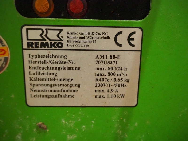 Remko mobile dehumidifier, type: AMT 80-E, number: 707U5271, 230 V, 1 Ph, 50 Hz, 4.9 A, 1.1 kW, refrigerant: R407c, dimensions: 480 mm x 500 mm x 900 mm.
