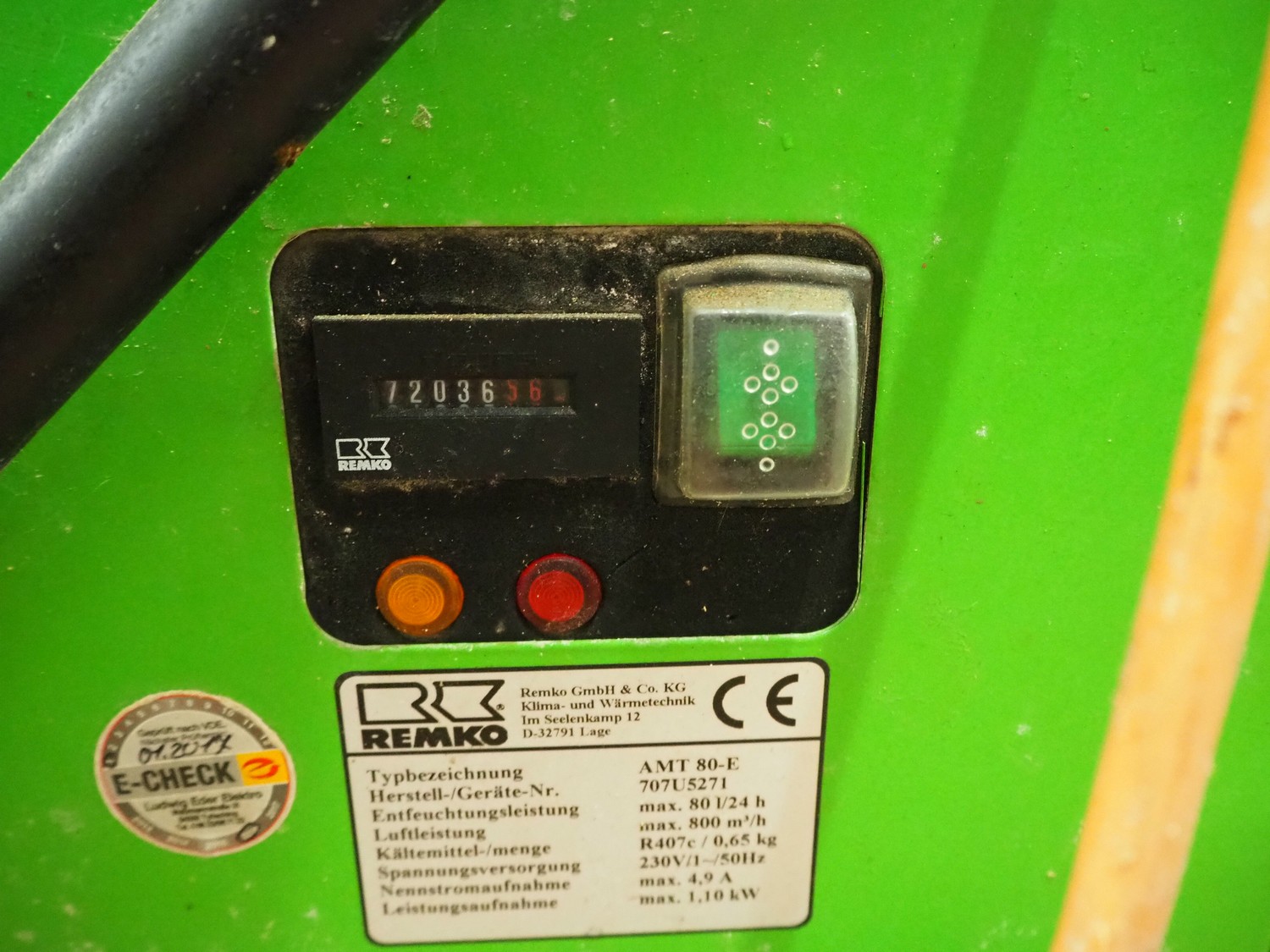 Remko mobile dehumidifier, type: AMT 80-E, number: 707U5271, 230 V, 1 Ph, 50 Hz, 4.9 A, 1.1 kW, refrigerant: R407c, dimensions: 480 mm x 500 mm x 900 mm.