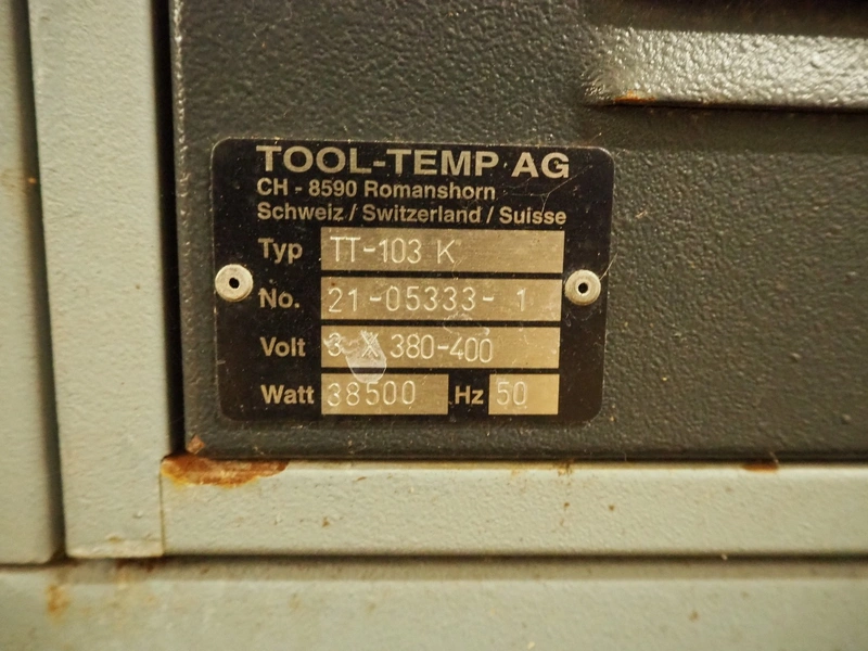 Sanyo outside unit for air conditioning, serial number: 00010527, year of construction: 17-10-2005, 400 V, 64 A, 11 kW, maximum temperature: 43°C, minimum temperature: -7°C, refrigerant: R410a, 3.6 kg, total dimensions: 1200 mm x 1000 mm x 1550 mm and Tool Temp temperature control unit, type: TT-103 K, number: 21-05333-1, 3 x 380-400 V, 50 Hz.