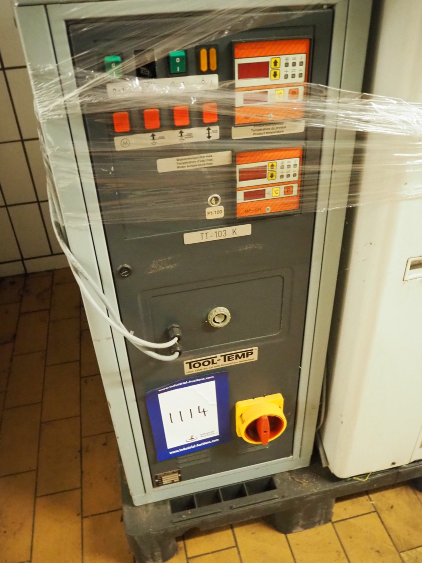 Sanyo outside unit for air conditioning, serial number: 00010527, year of construction: 17-10-2005, 400 V, 64 A, 11 kW, maximum temperature: 43°C, minimum temperature: -7°C, refrigerant: R410a, 3.6 kg, total dimensions: 1200 mm x 1000 mm x 1550 mm and Tool Temp temperature control unit, type: TT-103 K, number: 21-05333-1, 3 x 380-400 V, 50 Hz.