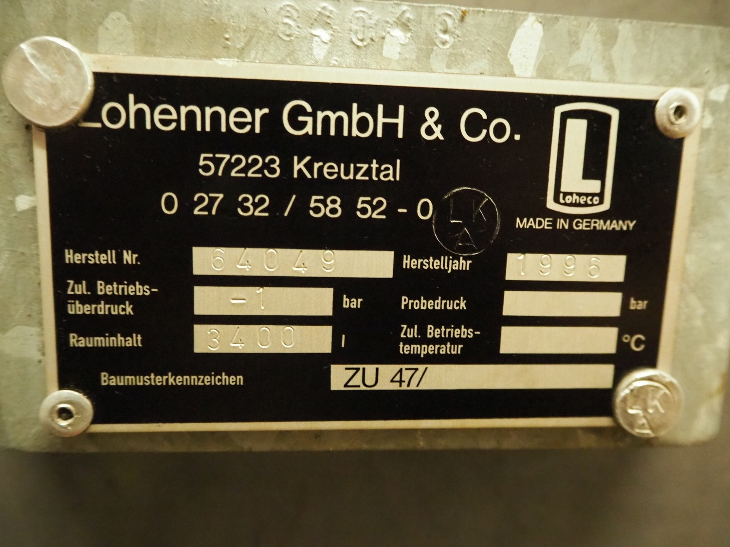 Lohenner GmbH & Co. steel pressure vessel, number: 64049, year of construction: 1996, volume: 3400 liter, dimensions: Ø 1600 mm x 2150 mm.
