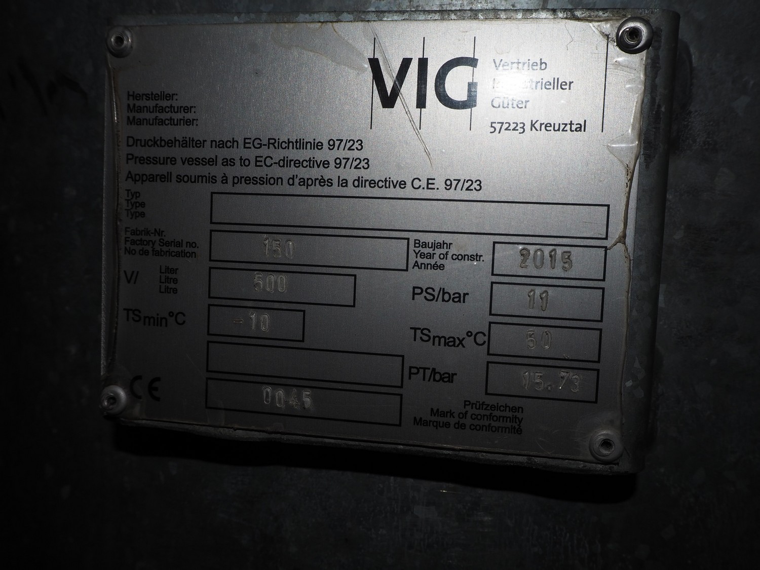 VIG pressure vessel, serial number: 150, year of construction: 2015, volume: 500 liter, PS: 11 bar, PT: 15.73 bar, temperature minimum: -10˚ / temperature maximum: +50˚C, diameter vessel: 650 mm, height vessel: 1900 mm.