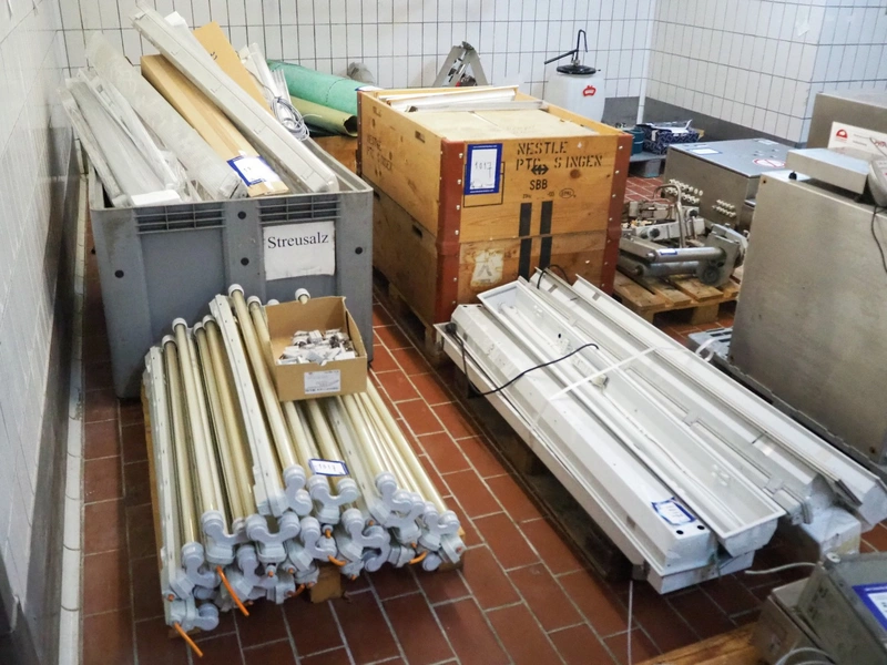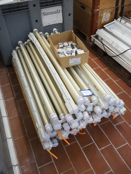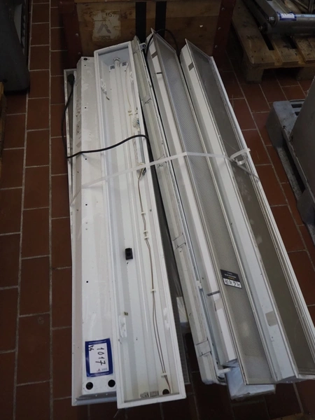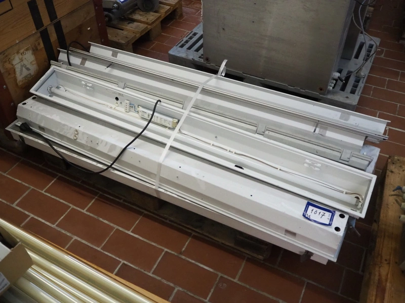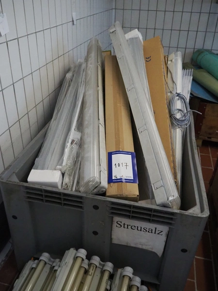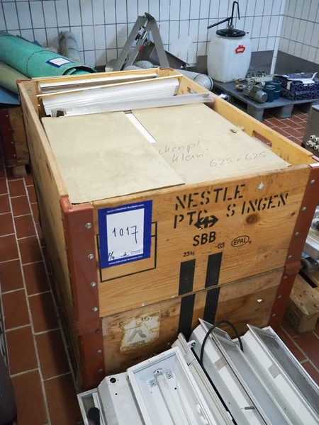2 pallets and pallet box with light fixtures, dimensions: (2x) 1400 mm x 800 mm x 600 mm and 1700 mm x 800 mm x 1700 mm, pallet box with covers and ceiling tiles, dimensions tiles: 625 mm x 625 mm, total dimensions: 1200 mm x 800 mm x 1200 mm.