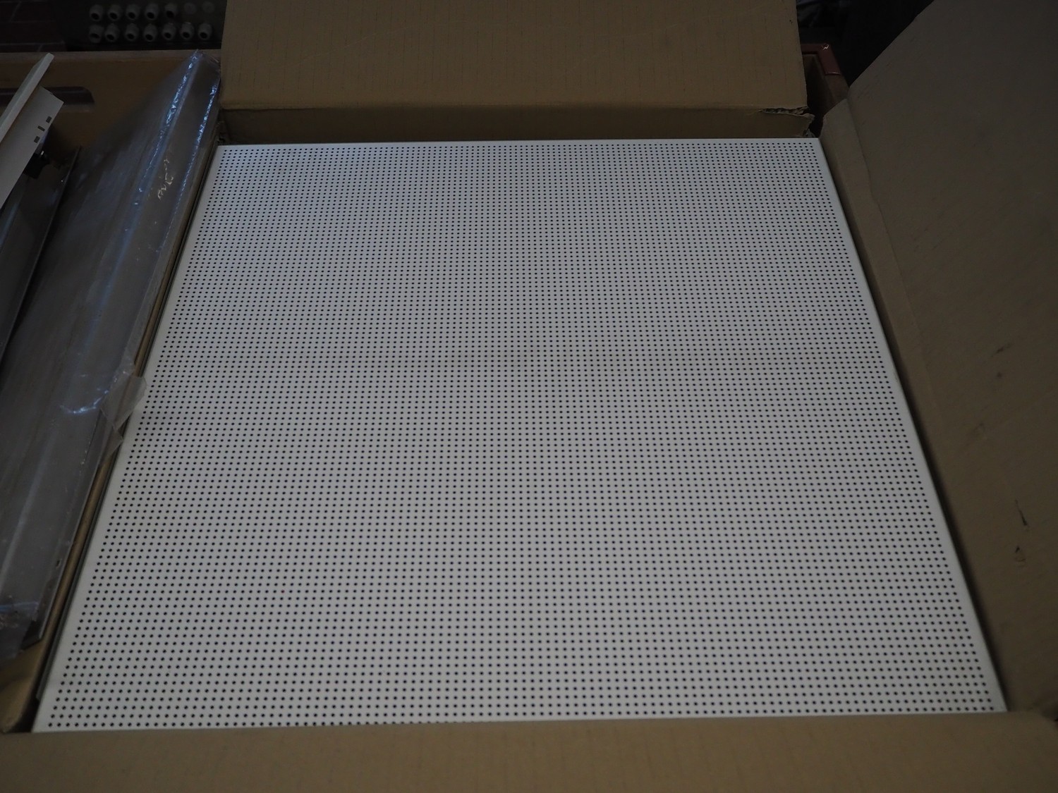 2 pallets and pallet box with light fixtures, dimensions: (2x) 1400 mm x 800 mm x 600 mm and 1700 mm x 800 mm x 1700 mm, pallet box with covers and ceiling tiles, dimensions tiles: 625 mm x 625 mm, total dimensions: 1200 mm x 800 mm x 1200 mm.