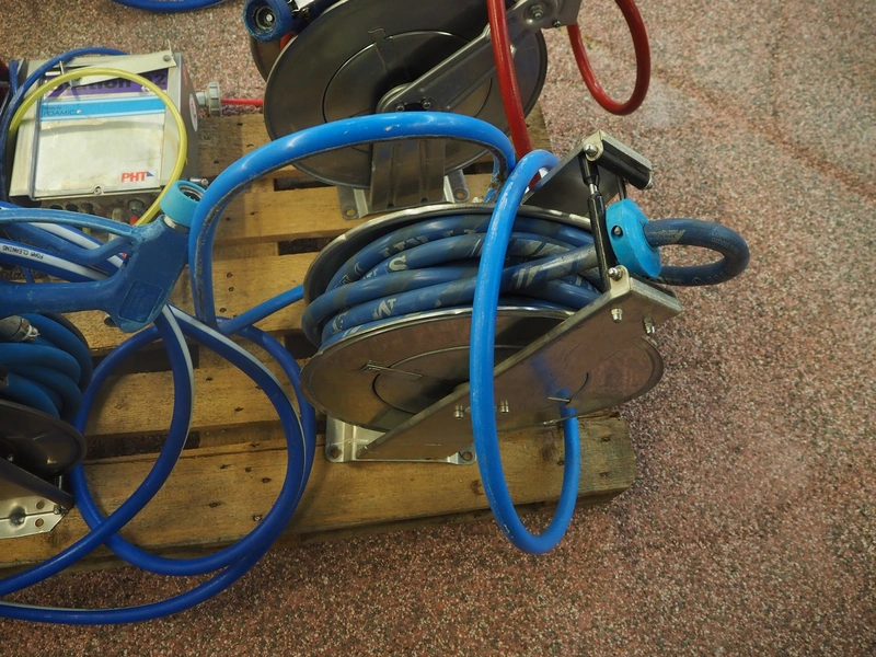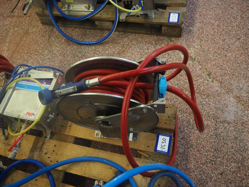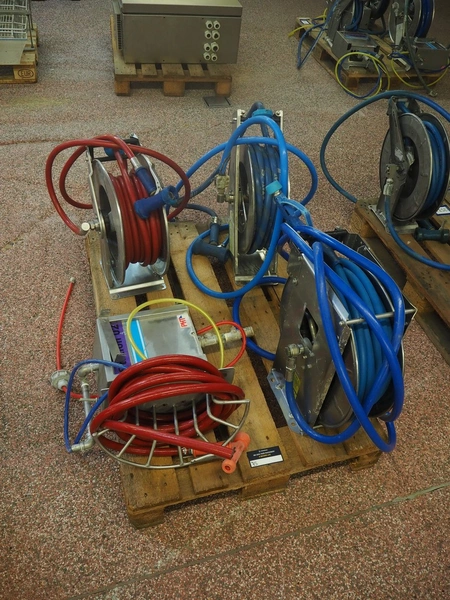 4 hose reels, Rapid Maschinenfabrik GmbH s/s hose reel with plastic hose and spray pistol, dimensions: 500 mm x 200 mm x 500 mm and plastic hose with spray pistol and 2 s/s hose reels. Nita s/s hose reel with plastic hose and spray pistol, type: 2129, serial number: 113419, year of construction: 2014, dimensions: 500 mm x 200 mm x 500 mm. S/s hose reel with hose and pistol, dimensions: 480 mm x 250 mm x 450 mm. S/s hose reel with hose and pistol, dimensions: 580 mm x 250 mm x 450 mm.