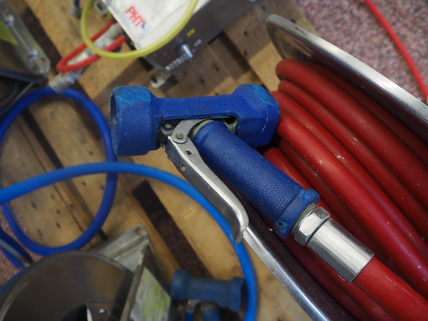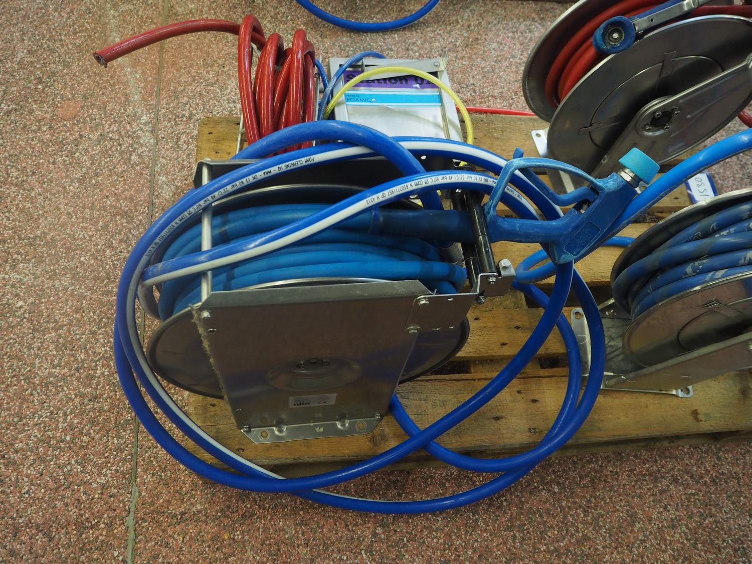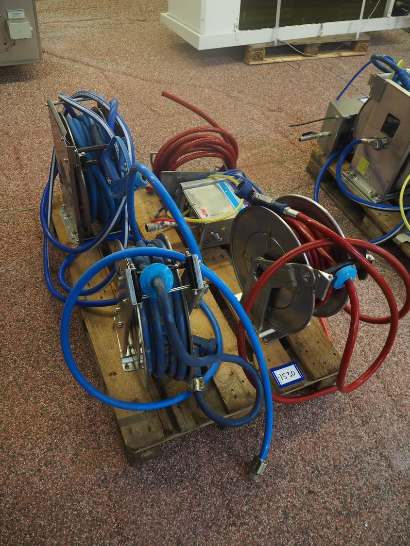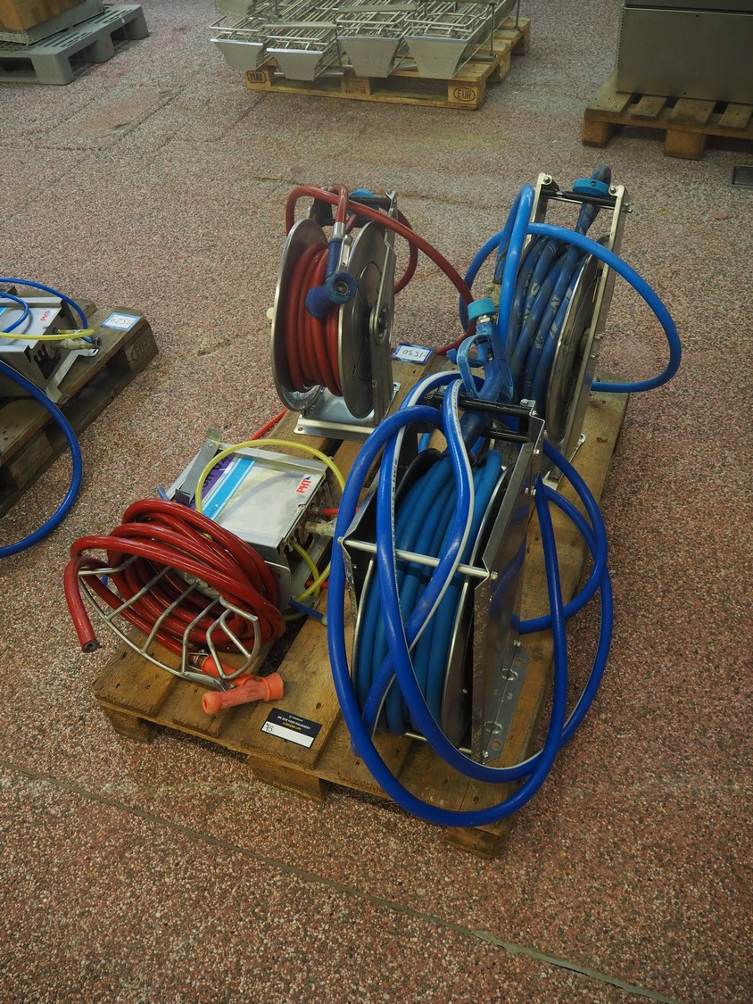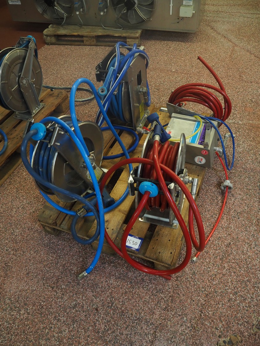 4 hose reels, Rapid Maschinenfabrik GmbH s/s hose reel with plastic hose and spray pistol, dimensions: 500 mm x 200 mm x 500 mm and plastic hose with spray pistol and 2 s/s hose reels. Nita s/s hose reel with plastic hose and spray pistol, type: 2129, serial number: 113419, year of construction: 2014, dimensions: 500 mm x 200 mm x 500 mm. S/s hose reel with hose and pistol, dimensions: 480 mm x 250 mm x 450 mm. S/s hose reel with hose and pistol, dimensions: 580 mm x 250 mm x 450 mm.