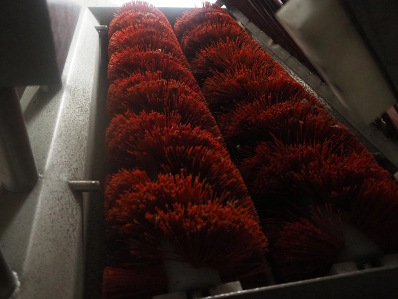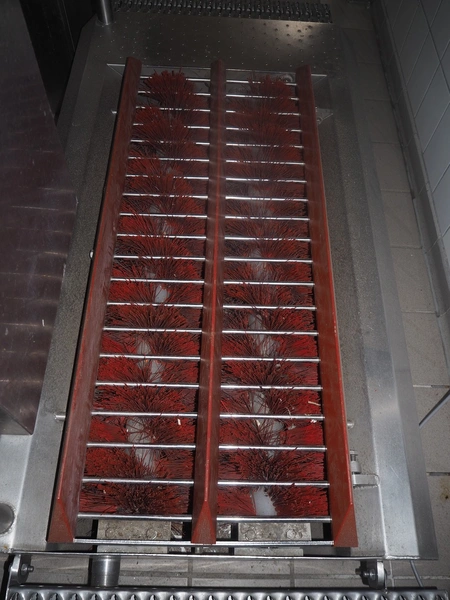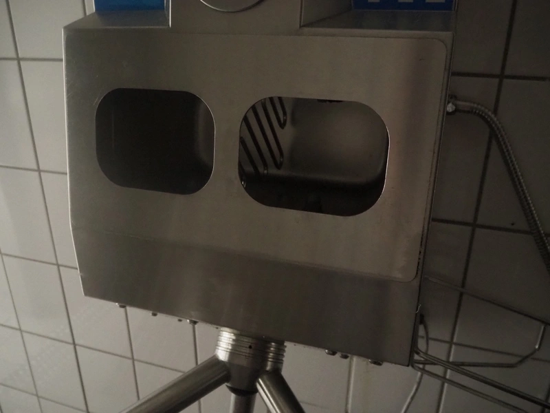 Hygiene station with sole cleaner, KET Edelstahltechnik GmbH hand disinfection unit and tourniquet, brush length: 1000 mm, total dimensions: 1850 mm x 1250 mm x 1500 mm.