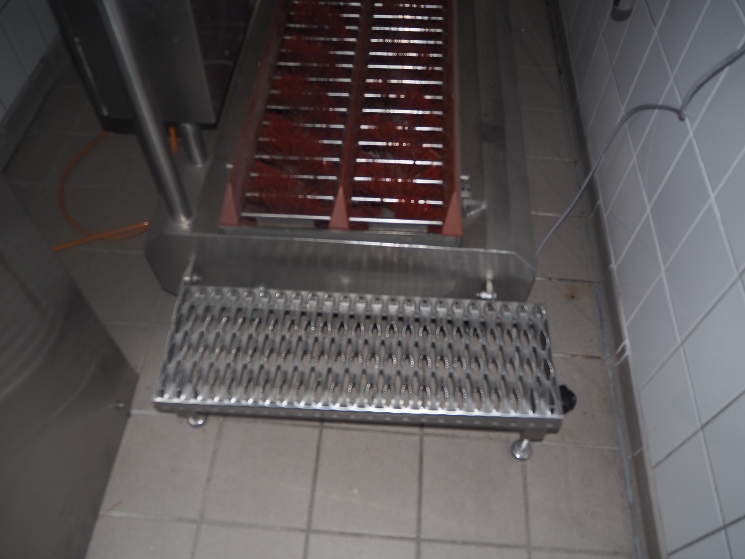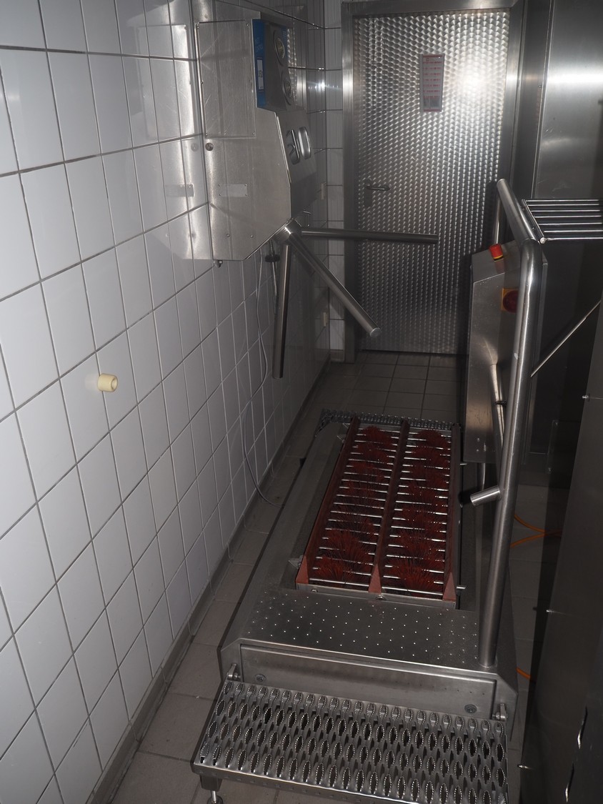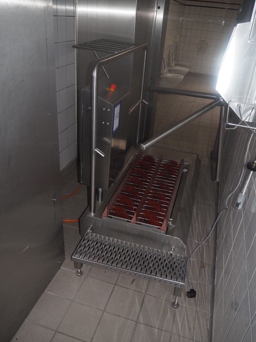 Hygiene station with sole cleaner, KET Edelstahltechnik GmbH hand disinfection unit and tourniquet, brush length: 1000 mm, total dimensions: 1850 mm x 1250 mm x 1500 mm.