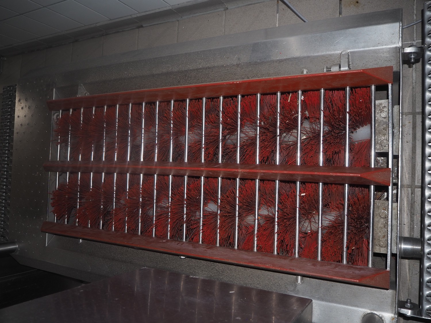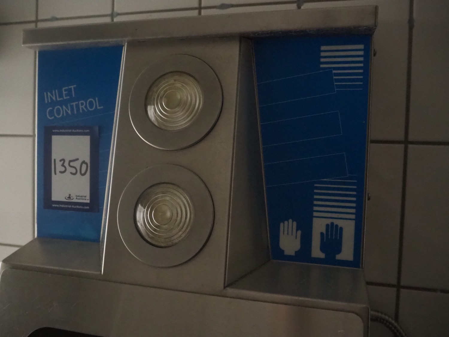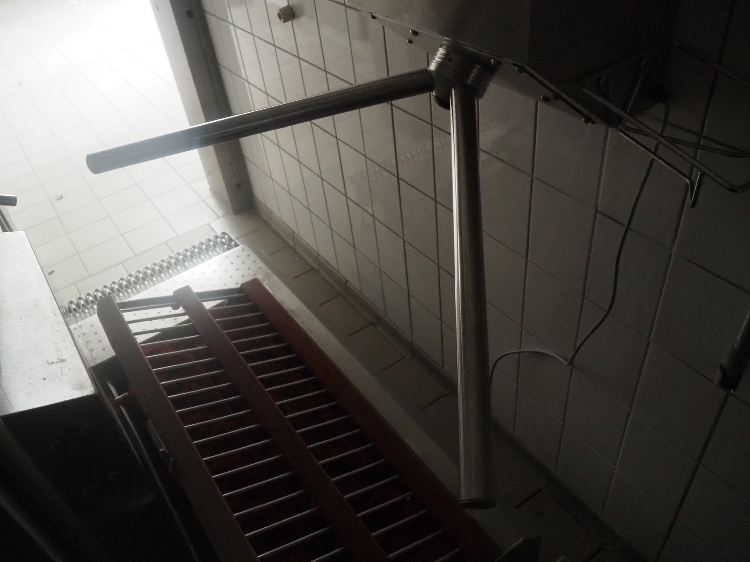 Hygiene station with sole cleaner, KET Edelstahltechnik GmbH hand disinfection unit and tourniquet, brush length: 1000 mm, total dimensions: 1850 mm x 1250 mm x 1500 mm.