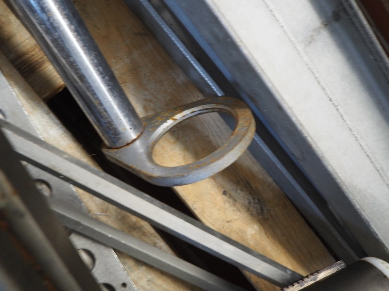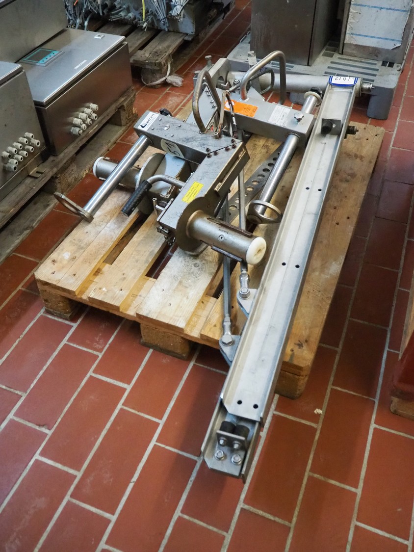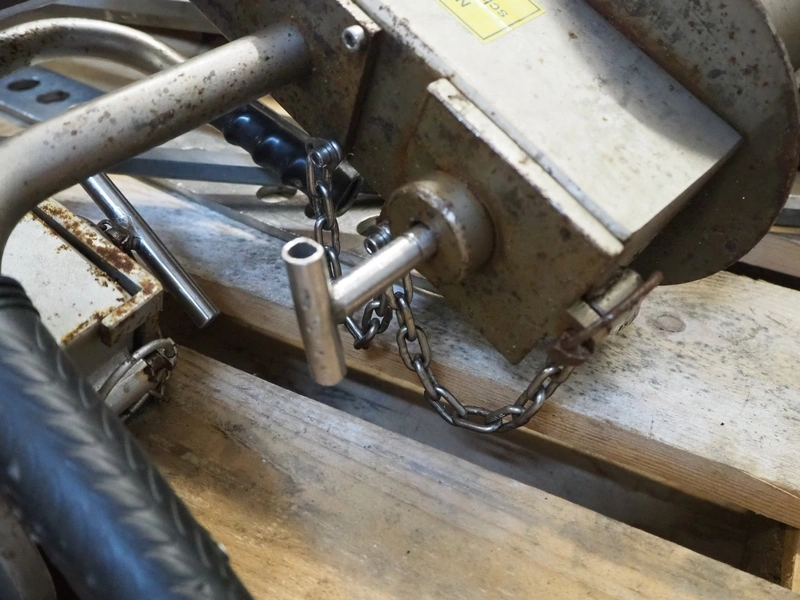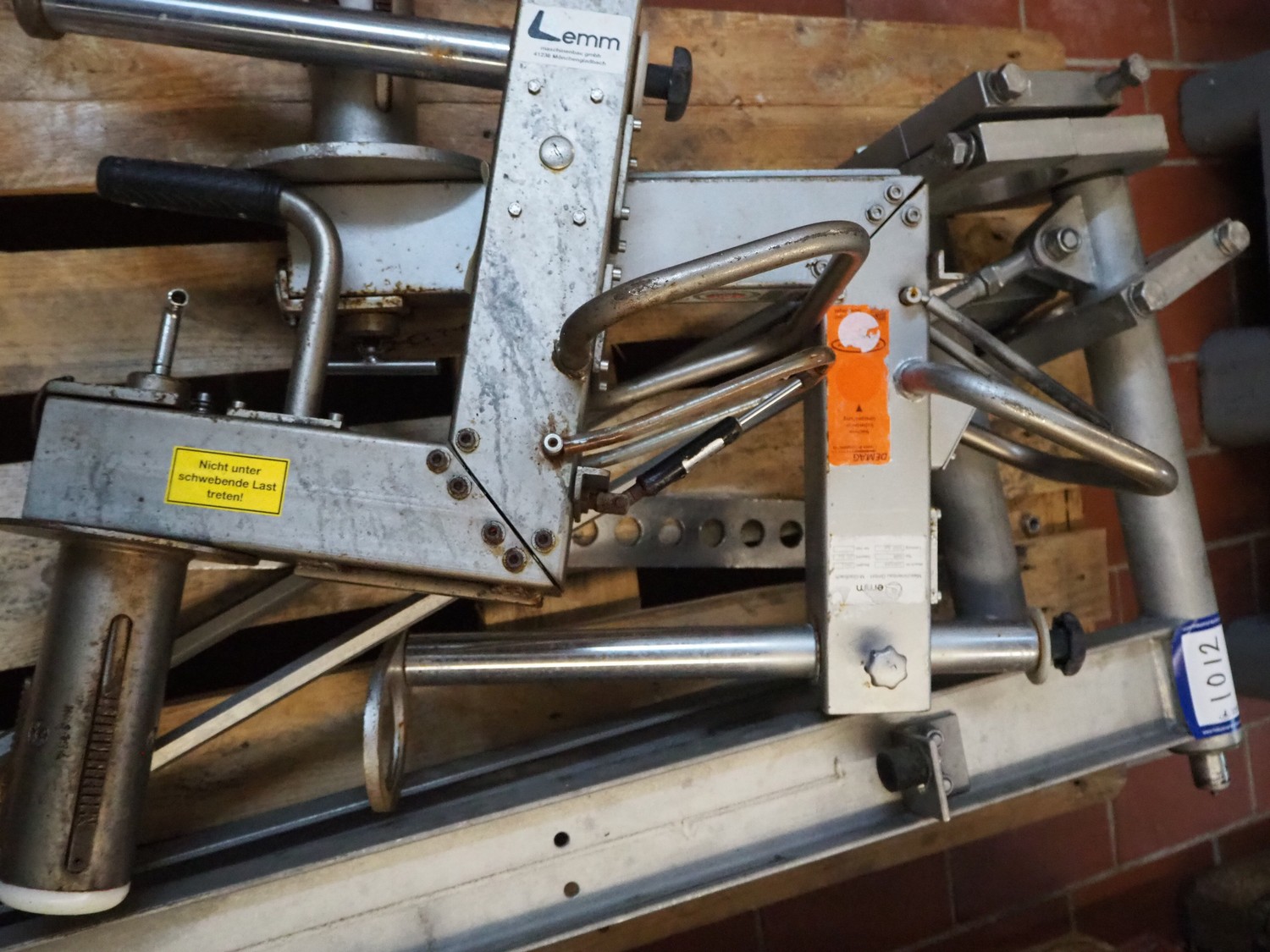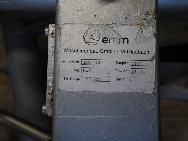 Pallet with parts for EMM film roll lifter, type: RWM, machine number: 100104, year of construction: 2001, capacity: 150 kg, dimensions: 1450 mm x 800 mm x 330 mm.