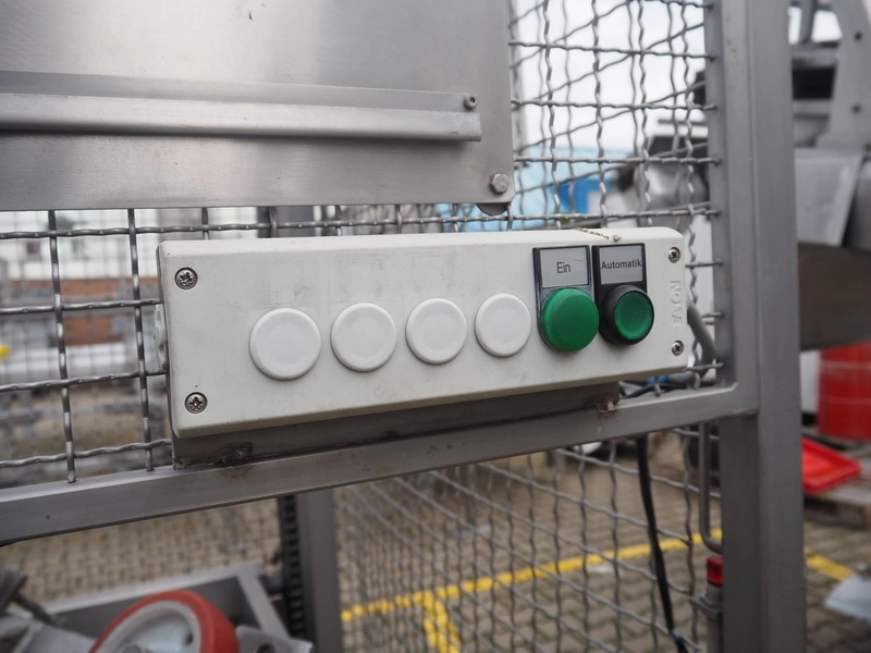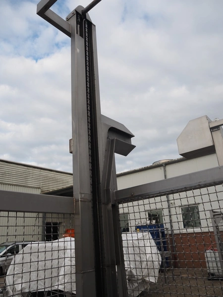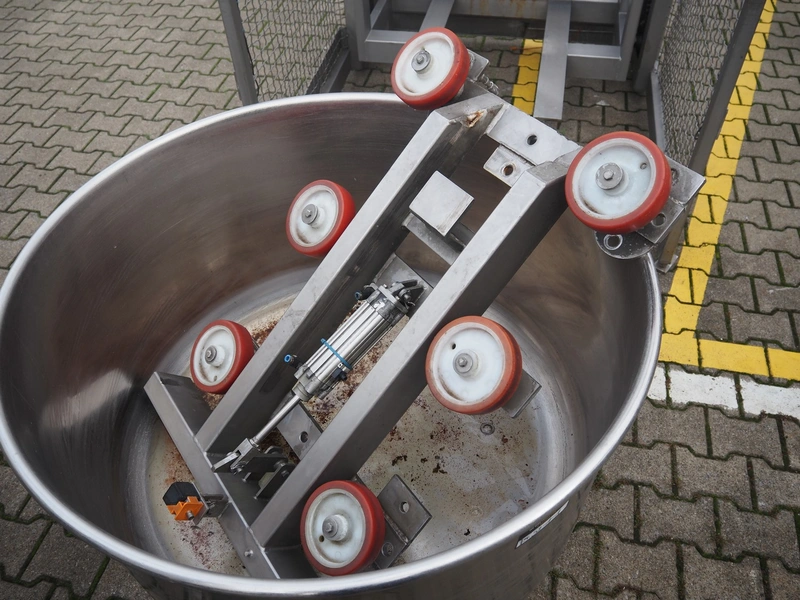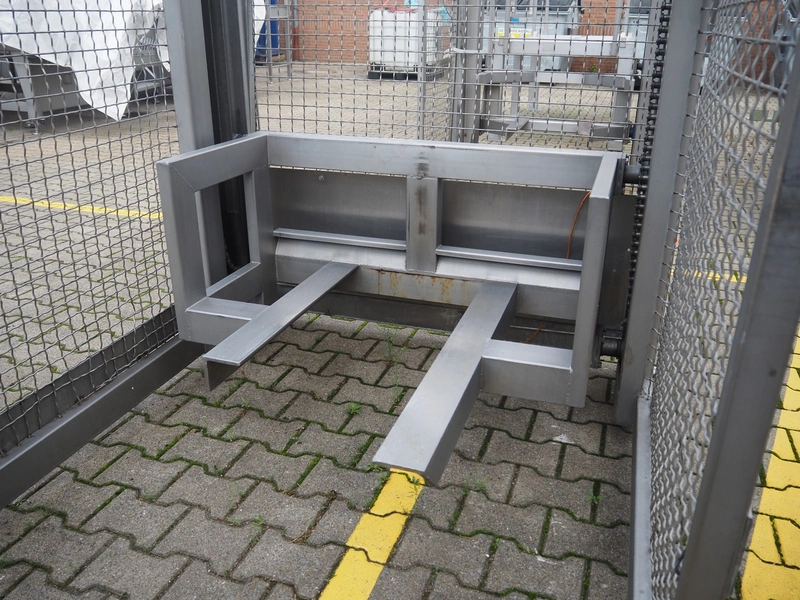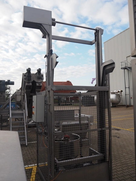 Lifter with mixing bowl with safety fence, lifting height: 2750 mm, total dimensions: 2000 mm x 2000 mm x 4000 mm. Including mobile s/s mixing bowl, dimensions bowl: Ø 970 mm x 530 mm, total dimensions: 1150 mm x 1000 mm x 950 mm.