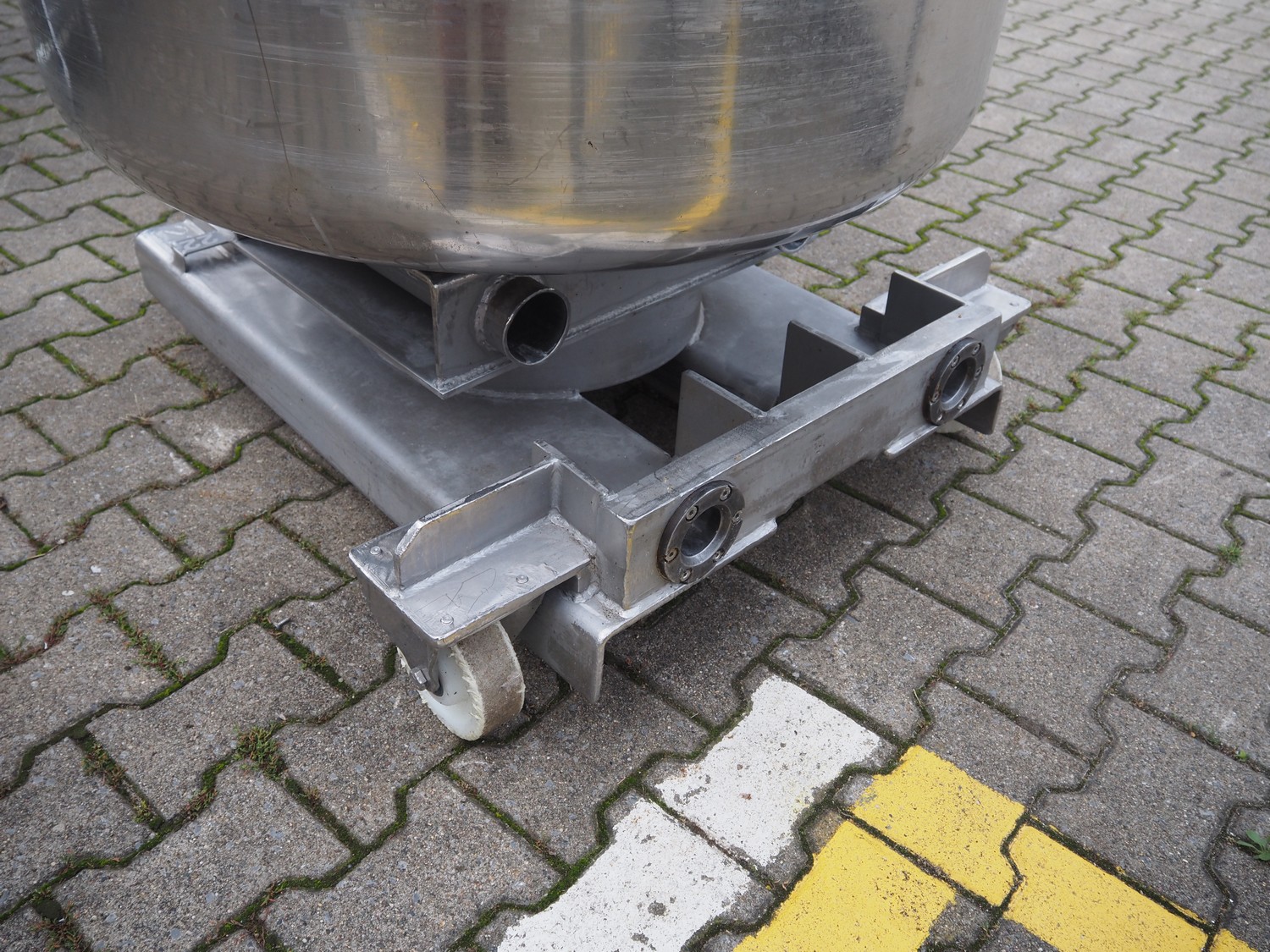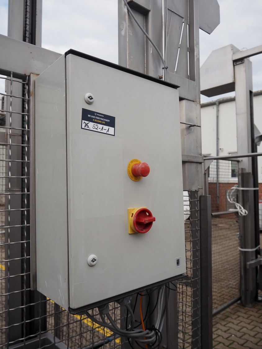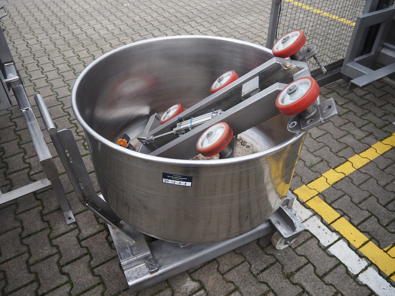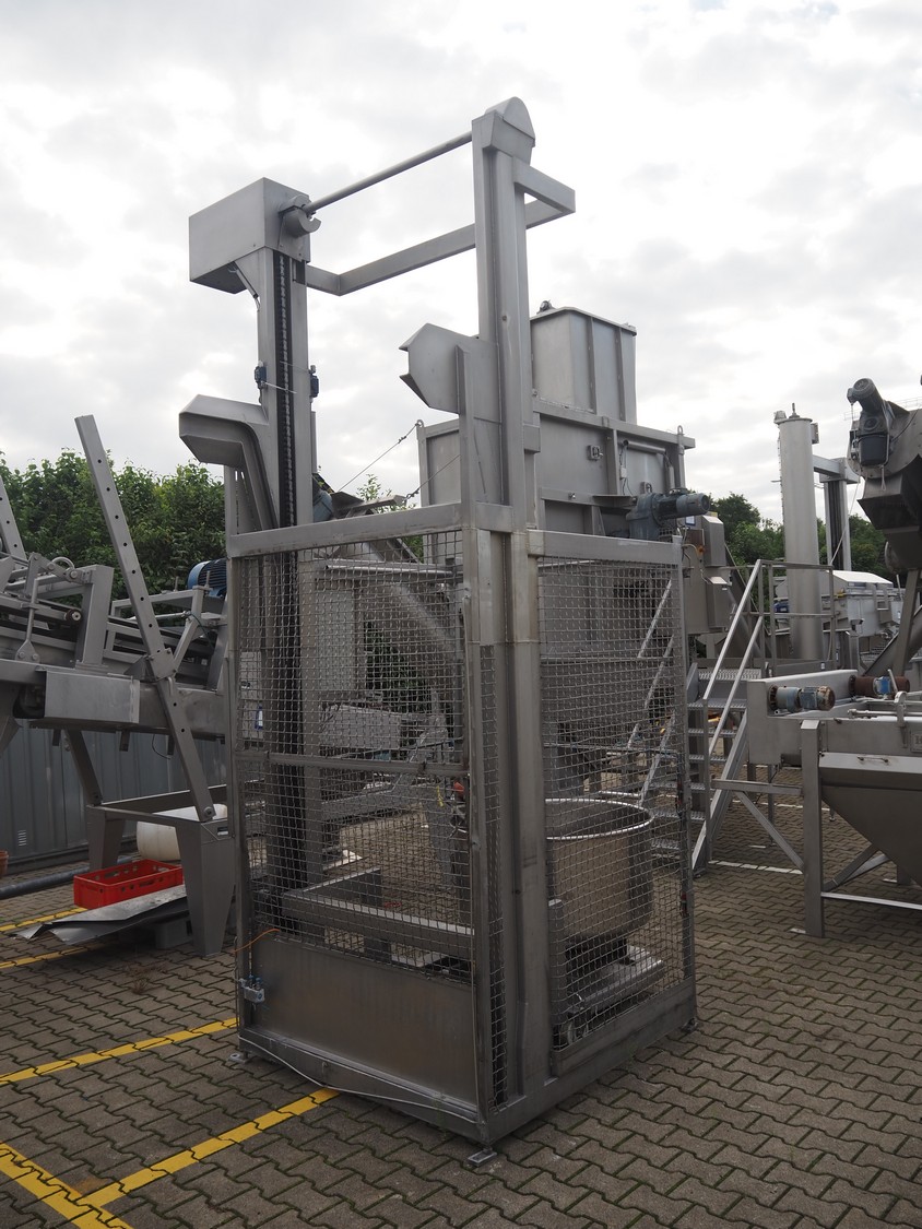 Lifter with mixing bowl with safety fence, lifting height: 2750 mm, total dimensions: 2000 mm x 2000 mm x 4000 mm. Including mobile s/s mixing bowl, dimensions bowl: Ø 970 mm x 530 mm, total dimensions: 1150 mm x 1000 mm x 950 mm.