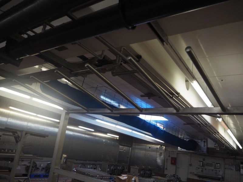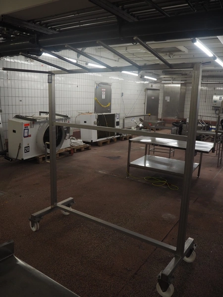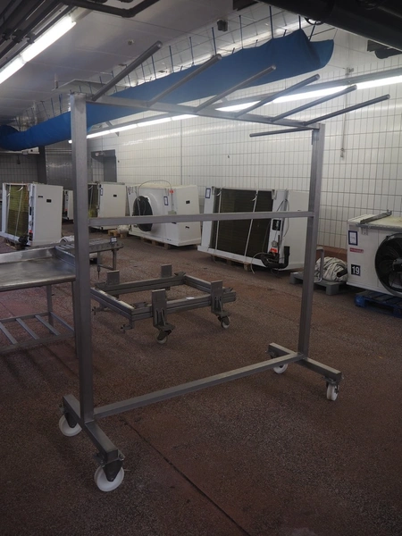 Mobile s/s rack with pegs, dimensions: 1950 mm x 1300 mm x 1100 mm.