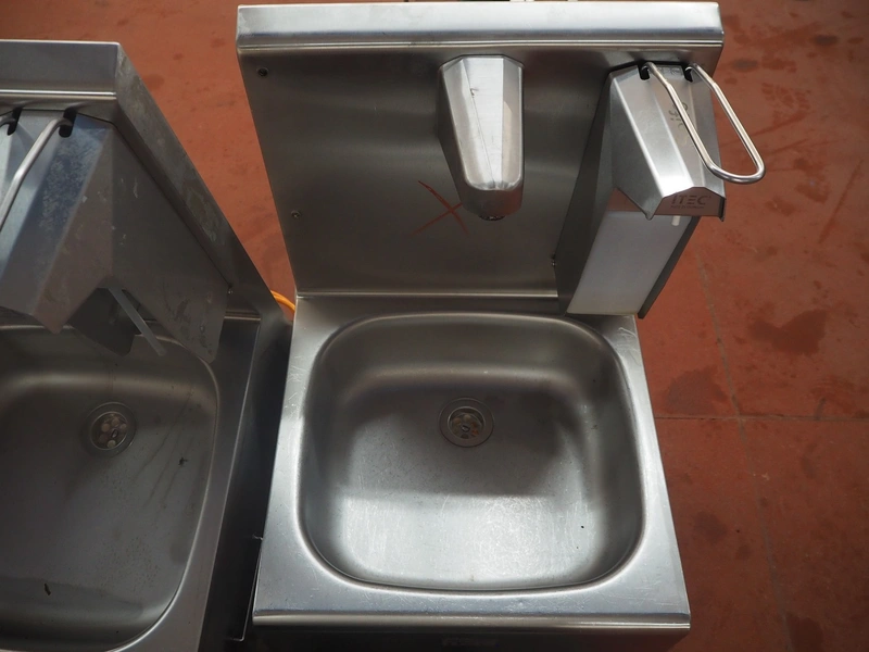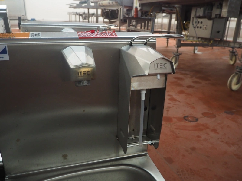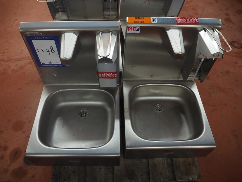 4 Itec s/s sinks with faucets, type: 20550-W, year of construction: 11/2018, 230 V, 50/60 Hz, 0.1 kW, sensor operated, 1 or 2 soap dispensers, dimensions: (4x) 450 mm x 430 mm x 580 mm.