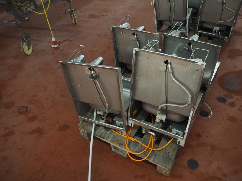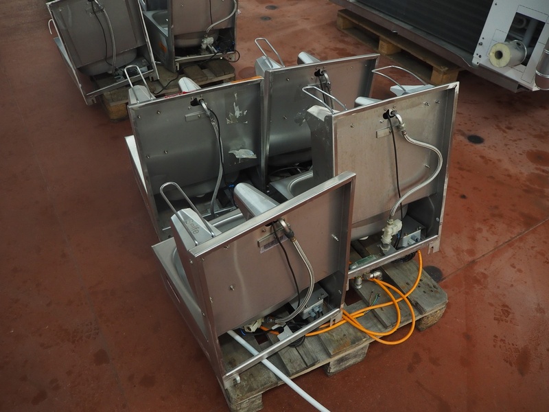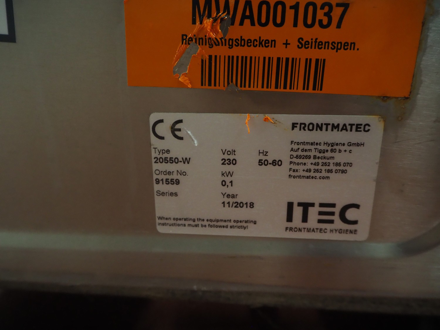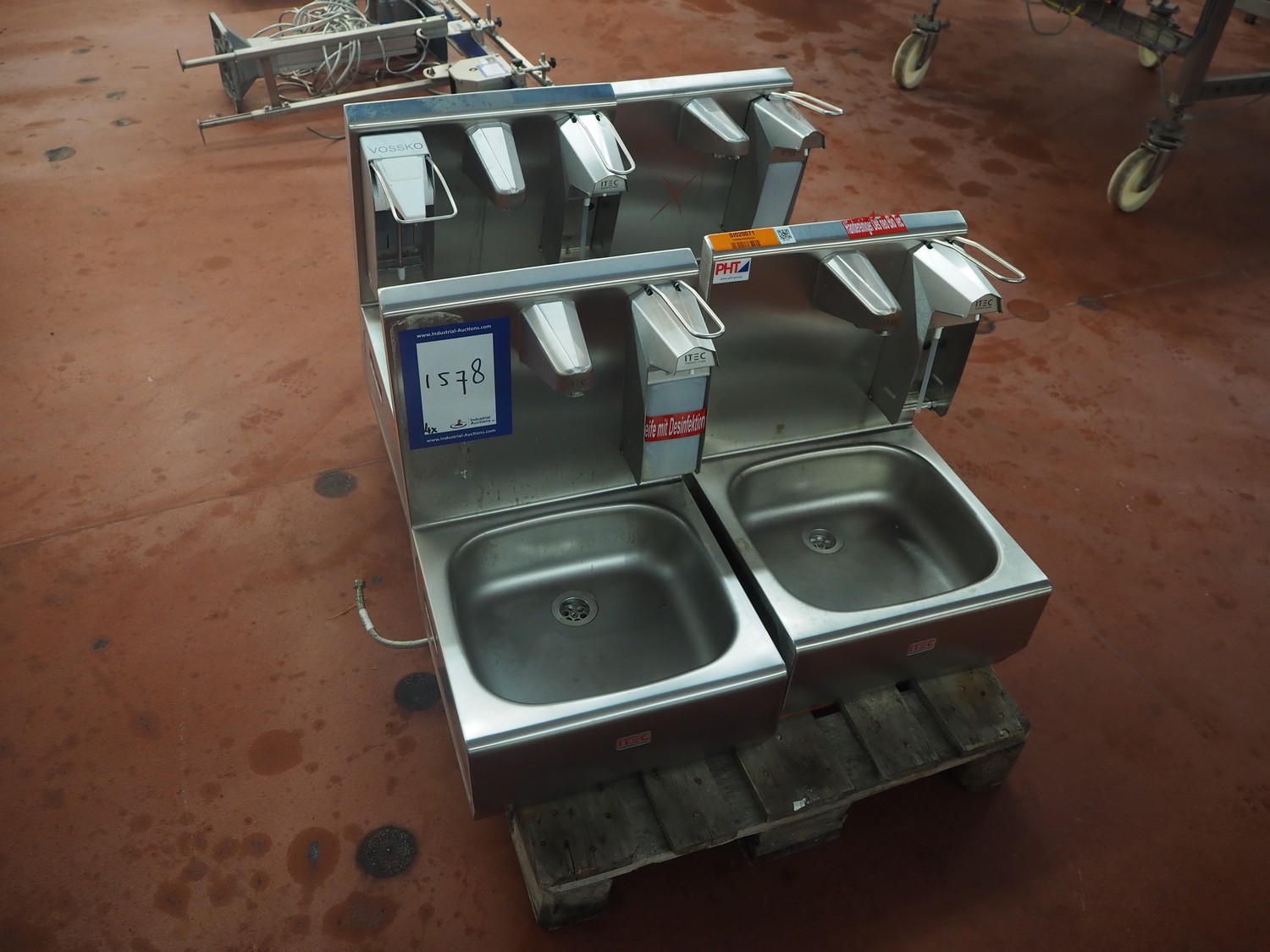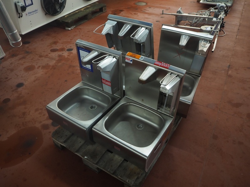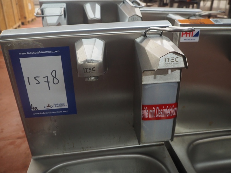 4 Itec s/s sinks with faucets, type: 20550-W, year of construction: 11/2018, 230 V, 50/60 Hz, 0.1 kW, sensor operated, 1 or 2 soap dispensers, dimensions: (4x) 450 mm x 430 mm x 580 mm.