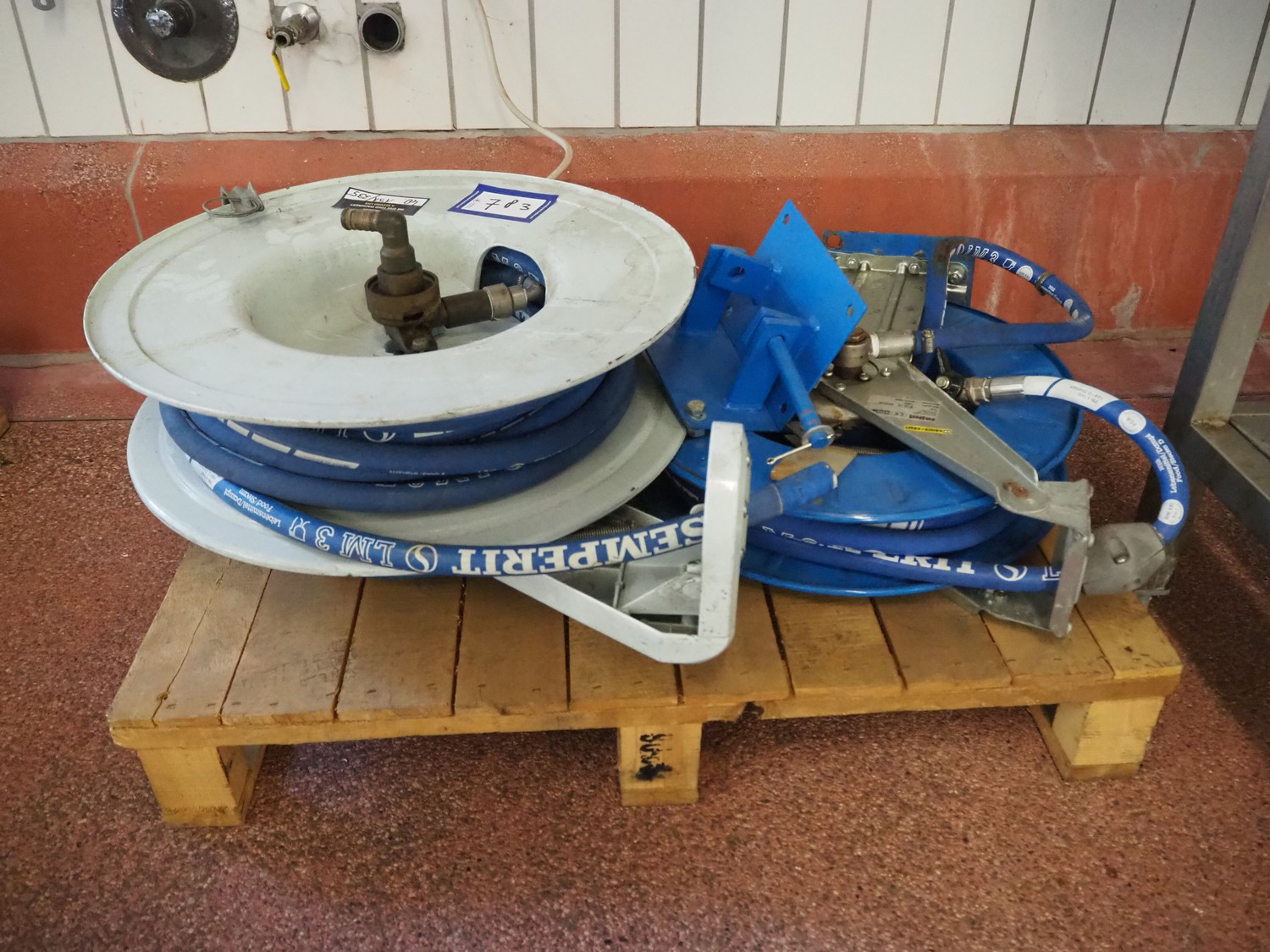 Pallet with Kaiser + Kraft hose reel with Semperit plastic hoses and Rapid hose reel, total dimensions: 1040 mm x 700 mm x 460 mm.