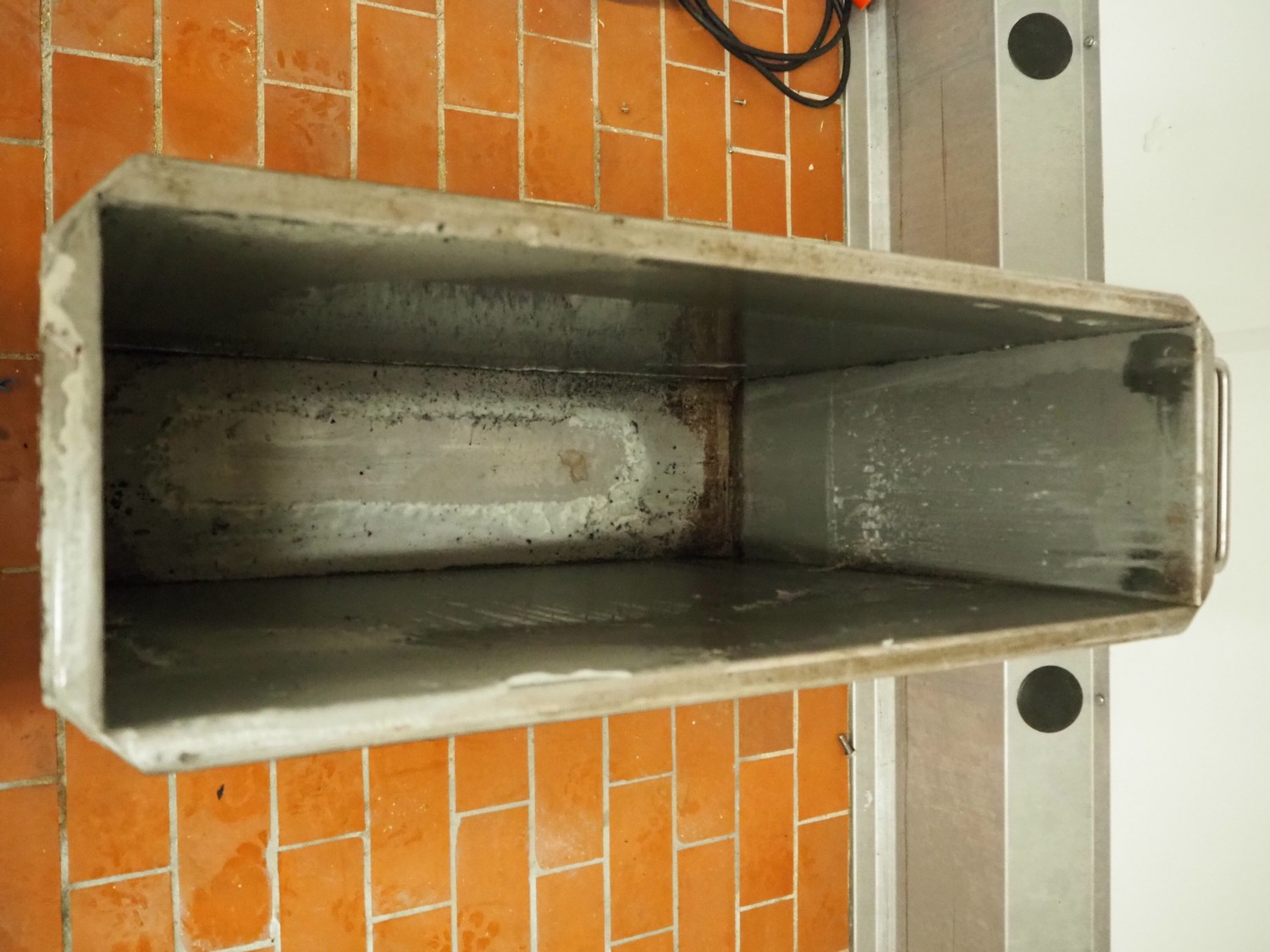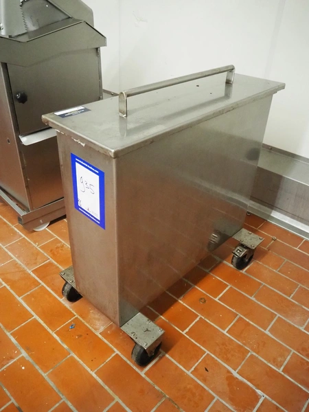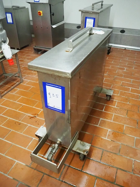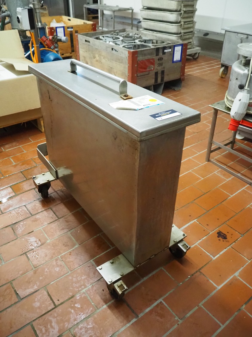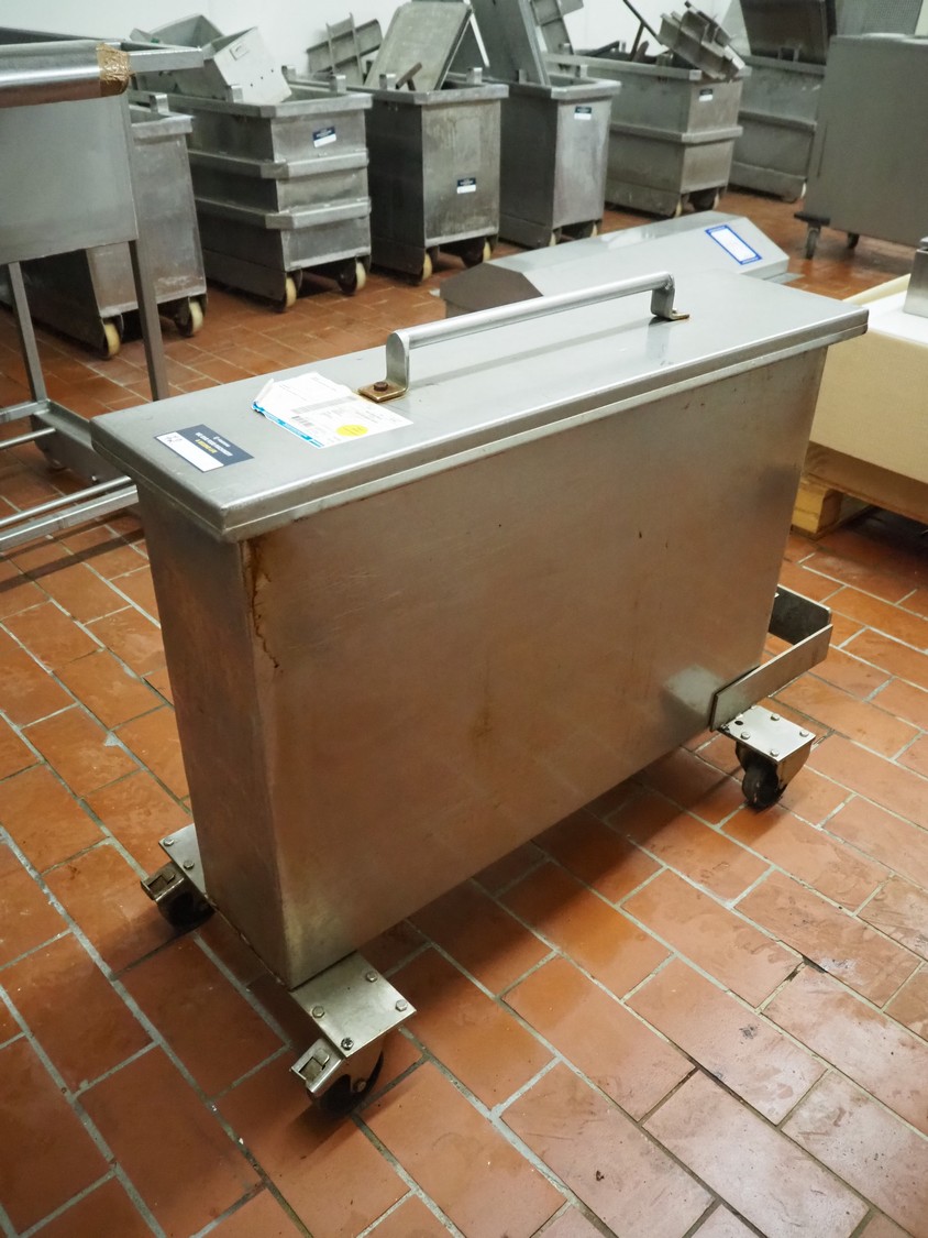 2 s/s mobile tubs, inside dimensions: 910 mm x 200 mm x 640 mm, total dimensions: 1100 mm x 450 mm x 880 mm and 950 mm x 300 mm x 850 mm.