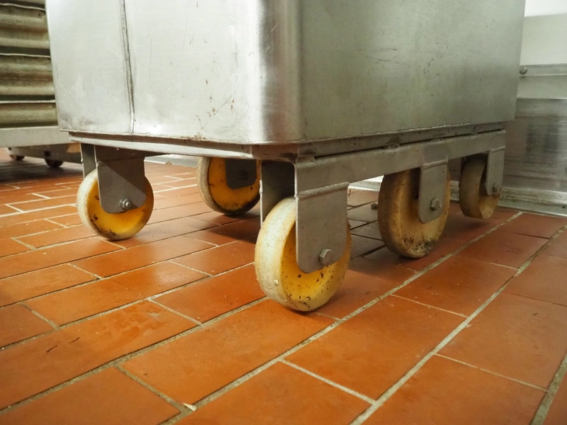 S/s mobile tub, inside dimensions: 820 mm x 580 mm x 440 mm, total dimensions: 870 mm x 620 mm x 660 mm.