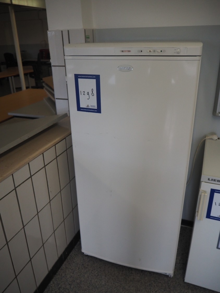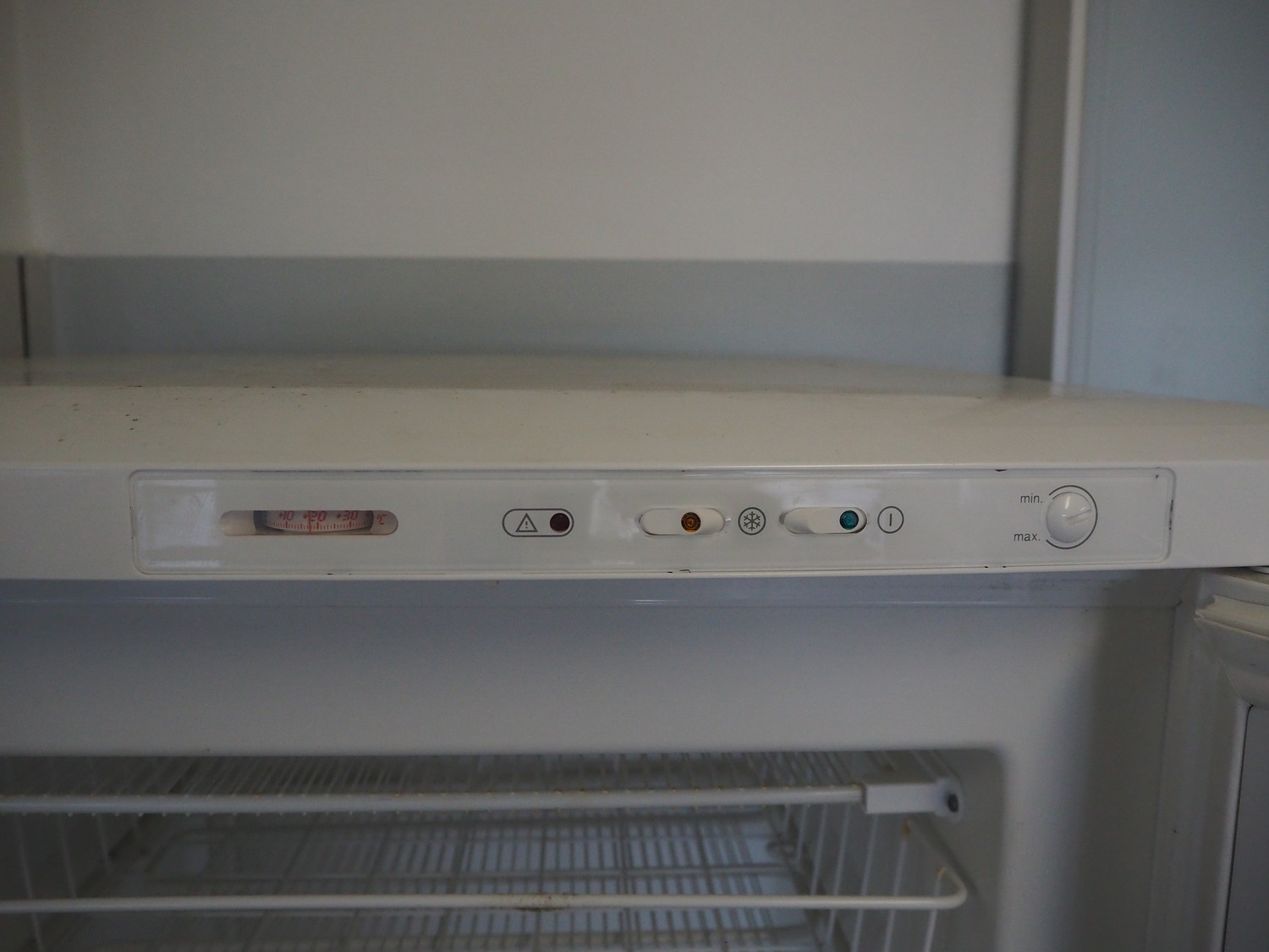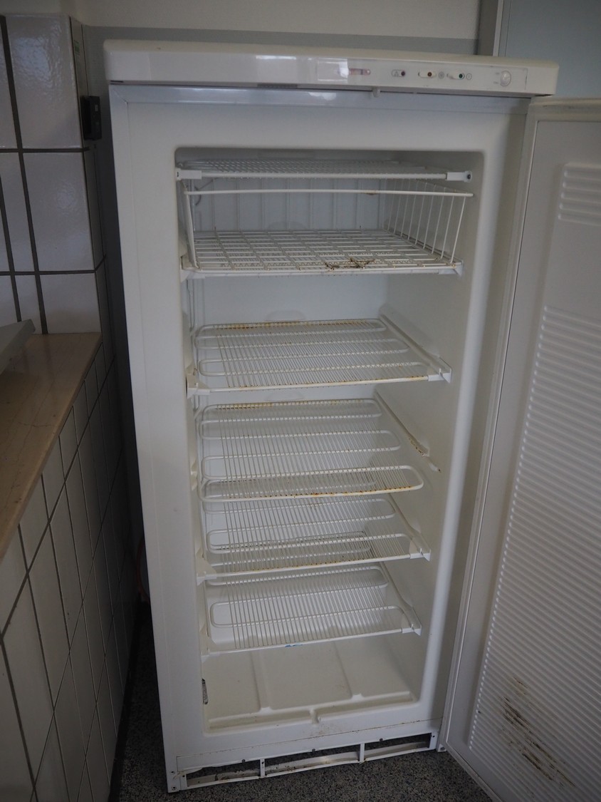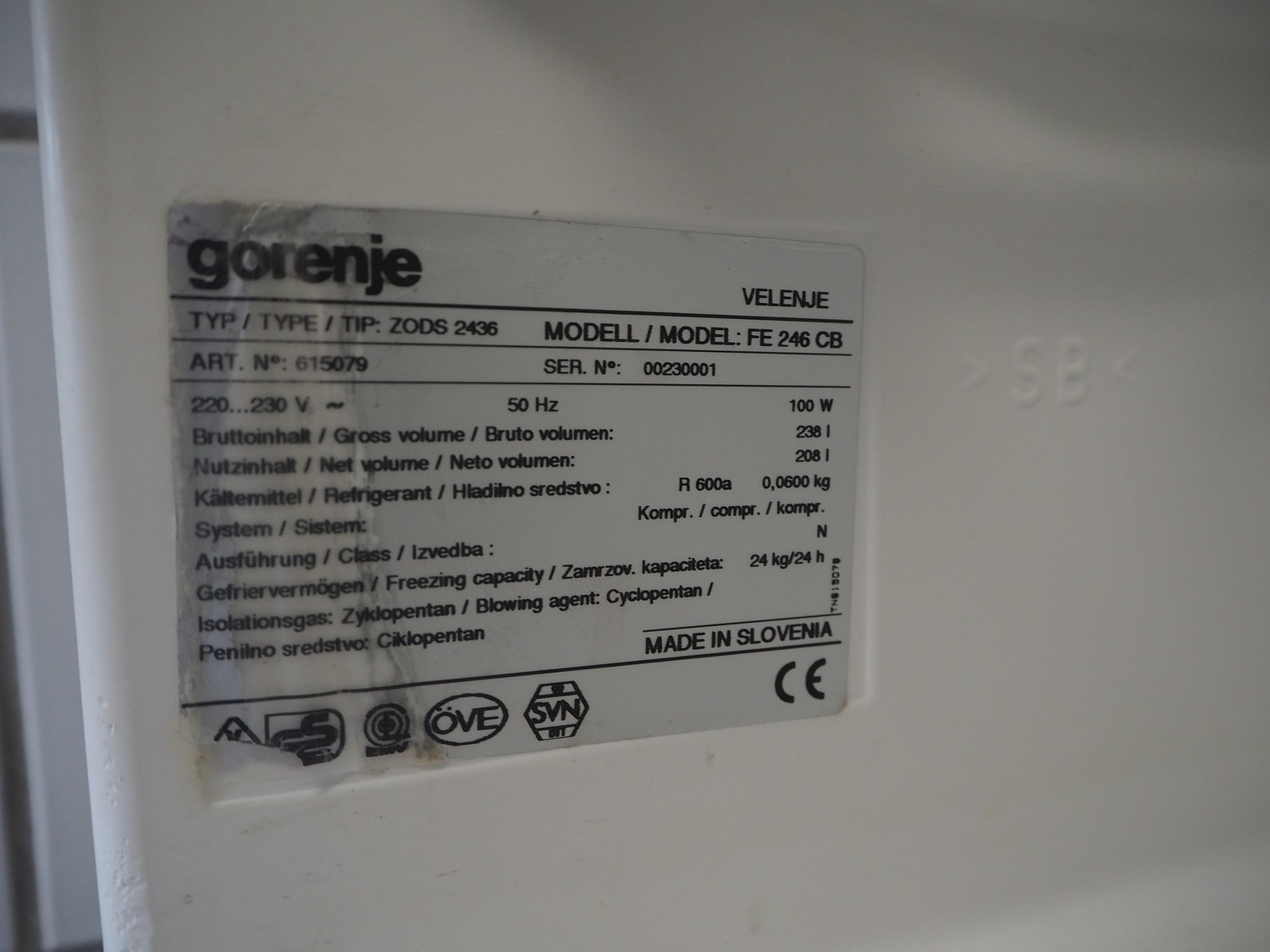 Gorenje freezer, type: ZODS 2436, serial number: 00230001, 220-230 V, 50 Hz, 100 W, refrigerant: R600a, 0.0600 kg, freezing capacity: 24 kg per 24 hours, volume: 208 liter, dimensions: 660 mm x 600 mm x 1470 mm. Missing door handle.