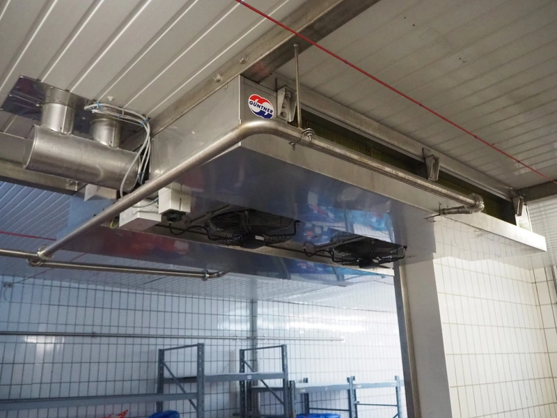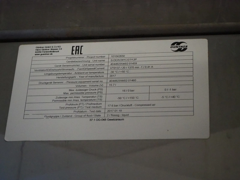 Güntner GmbH & Co. KG s/s evaporator, device type: S-DGN 041C/27/12P, serial number: 404492354/02.01459, year of construction: 2017, maximum / minimum pressure: 16 bar / -1 bar, maximum / minimum temperature: 150°C / -50°C, volume: 15.7 liter, 2 fans, dimensions: 2200 mm x 1600 mm x 300 mm.