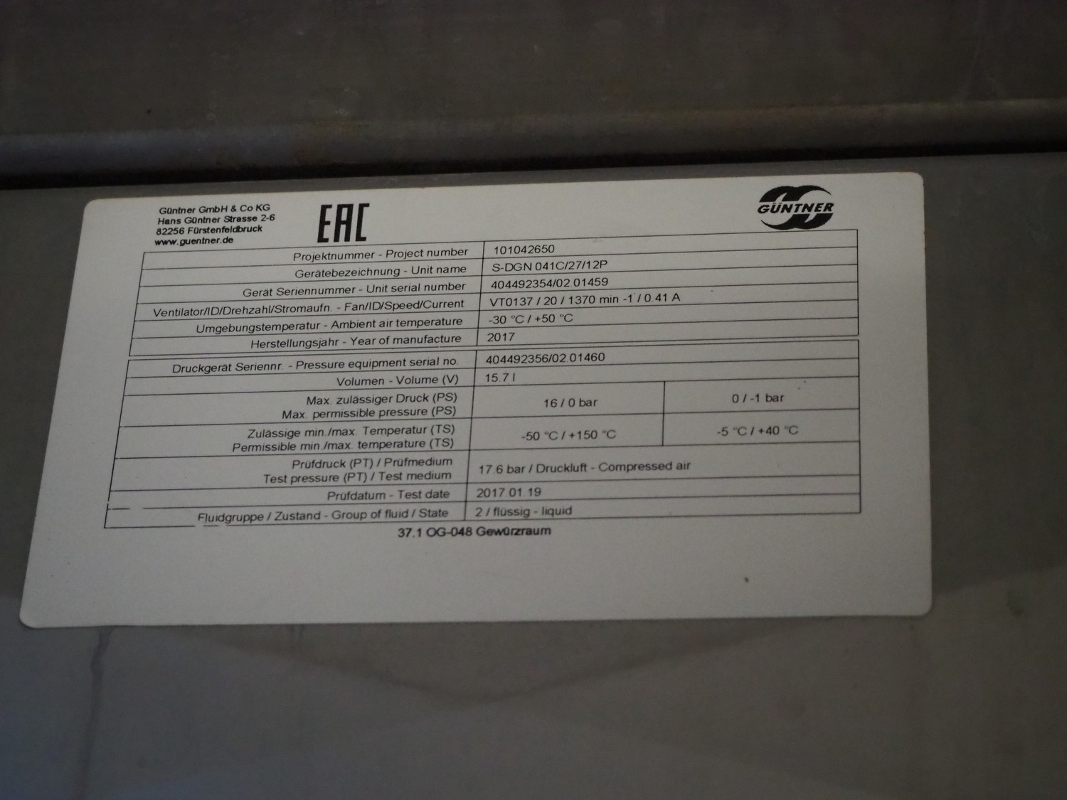 Güntner GmbH & Co. KG s/s evaporator, device type: S-DGN 041C/27/12P, serial number: 404492354/02.01459, year of construction: 2017, maximum / minimum pressure: 16 bar / -1 bar, maximum / minimum temperature: 150°C / -50°C, volume: 15.7 liter, 2 fans, dimensions: 2200 mm x 1600 mm x 300 mm.