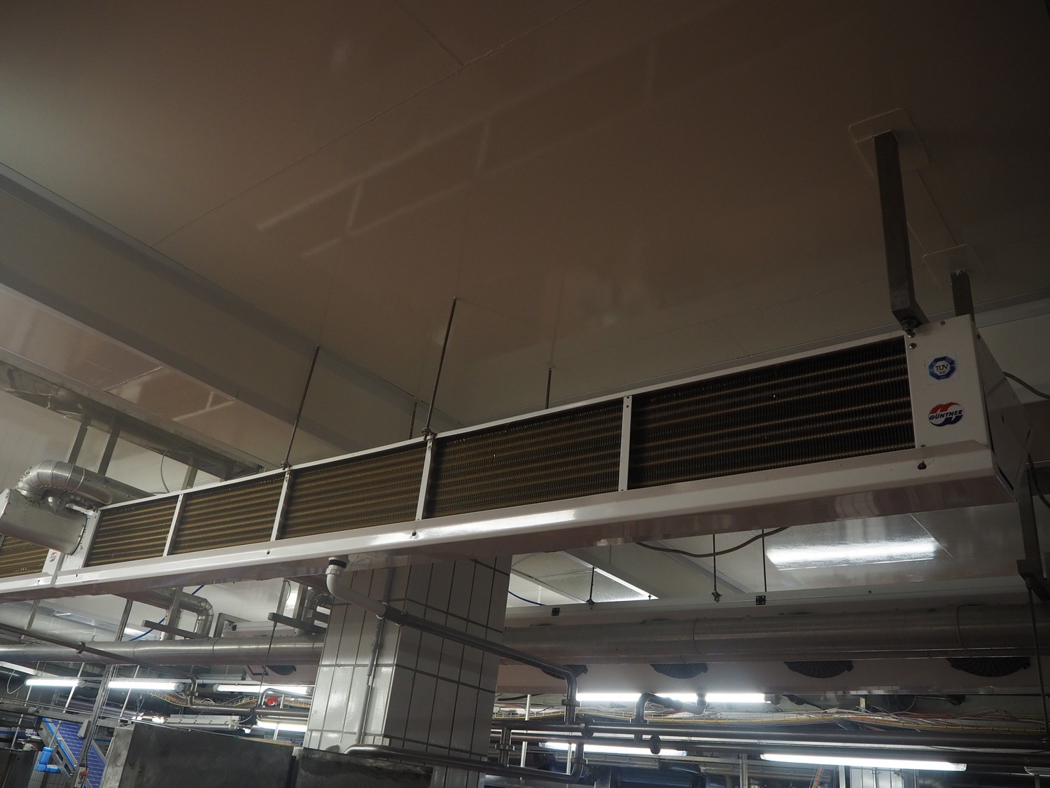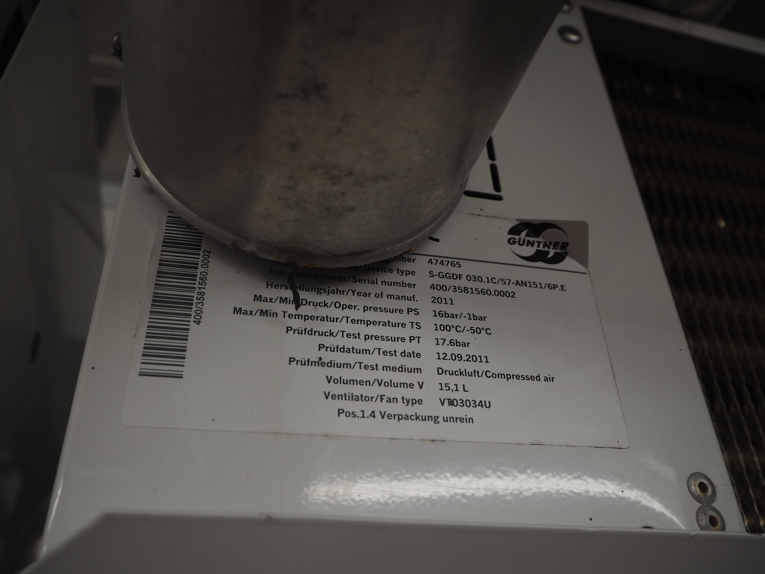 Güntner GmbH & Co. KG evaporator, device type: S-GGDF 030.1C/57-AN151/6P.E, serial number: 400/3581560.0002, year of construction: 2011, maximum / minimum pressure: 16 bar / -1 bar, maximum / minimum temperature: 100°C / -50°C, 5 fans, dimensions: 3900 mm x 500 mm x 350 mm.