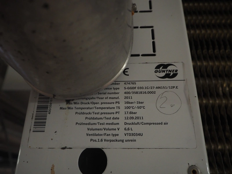 Güntner GmbH & Co. KG evaporator, device type: S-GGDF 030.1C/27-AN151/12P.E, serial number: 400/3581816.0002, year of construction: 2011, maximum / minimum pressure: 16 bar / -1 bar, maximum / minimum temperature: 100°C / -50°C, volume: 6.6 liter, 2 fans, dimensions: 1600 mm x 600 mm x 330 mm.