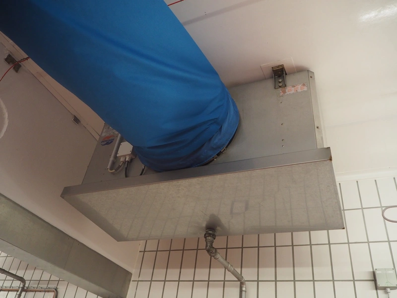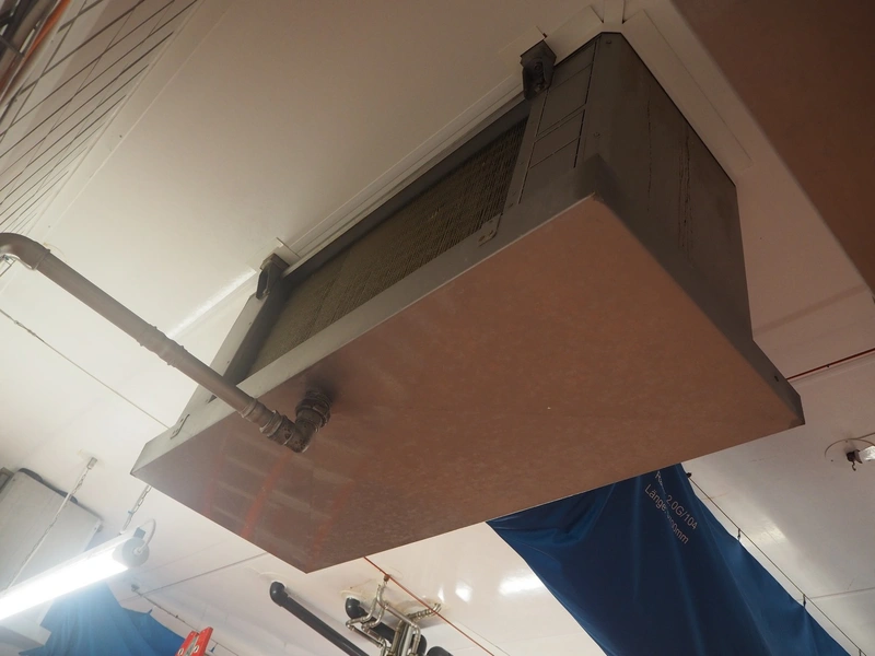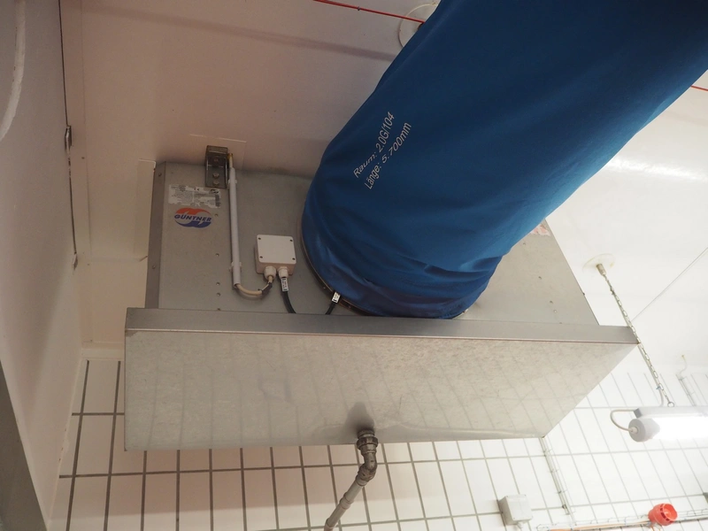 Güntner GmbH & Co. KG s/s evaporator with air sock, device type: S-GGN 051B/14/20P, serial number: 400/61279301, year of construction: 2005, maximum / minimum pressure: 16 bar / -1 bar, maximum / minimum temperature: 95°C / -50°C, volume: 13 liter, 1 fan, dimensions: 1400 mm x 500 mm x 690 mm.
