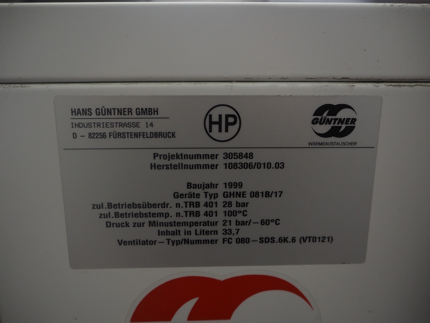 Güntner GmbH & Co. KG evaporator, type: GHNE 081B/17, number: 108306/010.03, year of construction: 1999, 1 fan, total dimensions: 2000 mm x 1500 mm x 1000 mm.