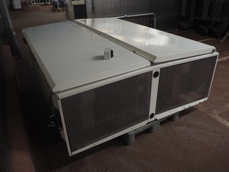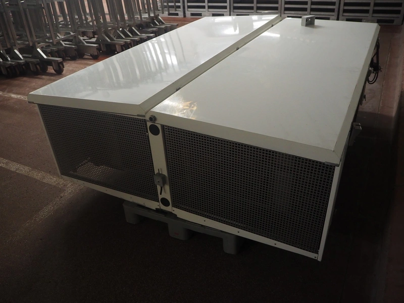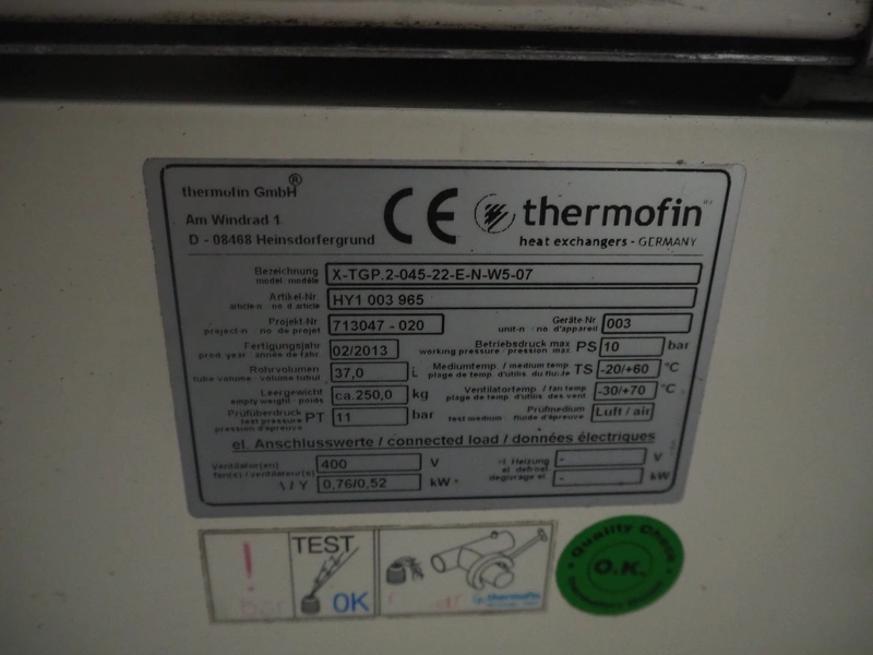 Thermofin evaporator, model: H-TGP.2-045-22-E-N-W5-07, article number: HY1 003 965, year of construction: 02/2013, 400 V, 0.76/0.52 kW, dimensions: 2450 mm x 1900 mm x 900 mm. Damaged.
