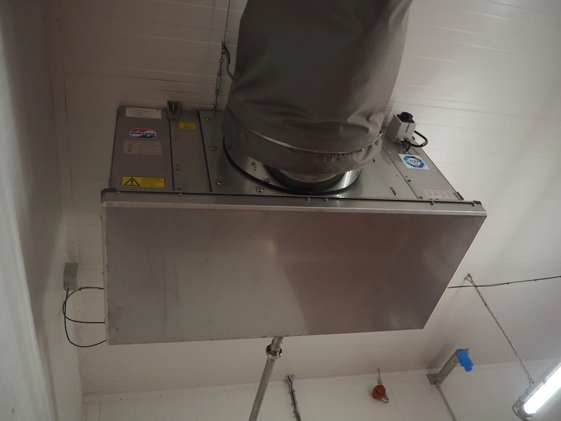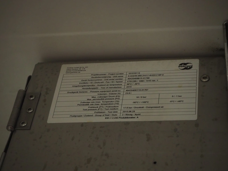 Güntner GmbH & Co. KG s/s evaporator with air sock, device type: S-GGHN 050.2H/17-ANS51/16P.E, serial number: 404204095/15.01768, year of construction: 2015, maximum / minimum pressure: 16 bar / -1 bar, maximum / minimum temperature: 100°C / -50°C, volume: 23.6 liter, 1 fan, dimensions: 1400 mm x 1000 mm x 750 mm.