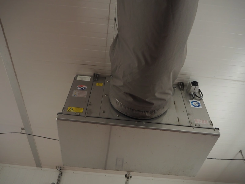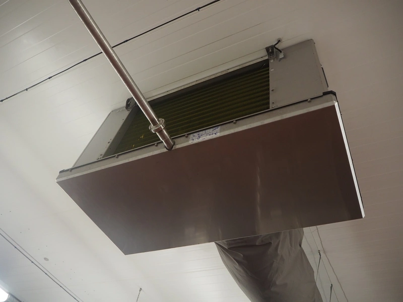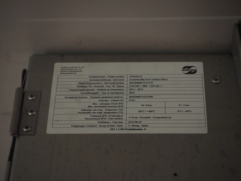 Güntner GmbH & Co. KG s/s evaporator with air sock, device type: S-GGHN 050.2H/17-ANS51/16P.E, serial number: 404204095/15.01770, year of construction: 2015, maximum / minimum pressure: 16 bar / -1 bar, maximum / minimum temperature: 100°C / -50°C, volume: 23.6 liter, 1 fan, dimensions: 1400 mm x 1000 mm x 750 mm.