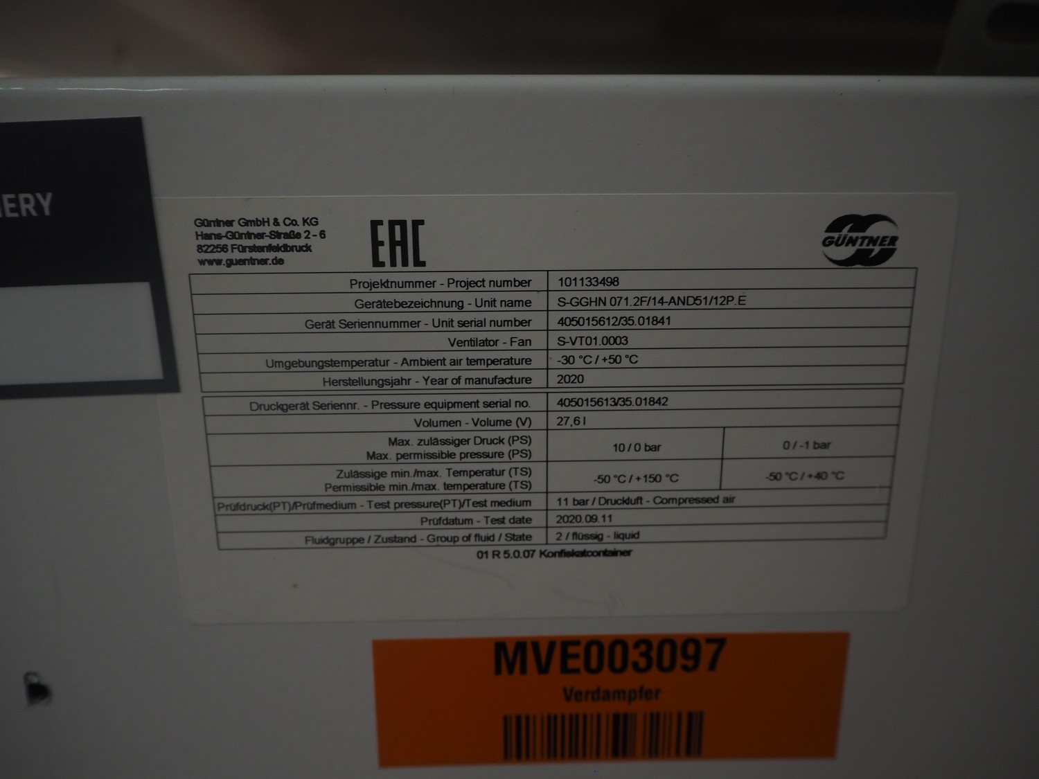 Güntner GmbH & Co. KG evaporator, type: S-GGHN 071.2F/14-AND51/12P.E, serial number: 405015612/35.01841, year of construction: 2020, 1 fan, dimensions: 2200 mm x 1000 mm x 1350 mm.