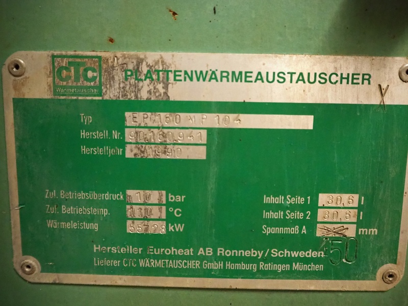 Euroheat AB Ronneby heat exchanger, type: EPC160MP104, number: 90.160.941, year of construction: 1990, maximum temperature: 110° C, dimensions: 1050 mm x 470 mm x 980 mm.